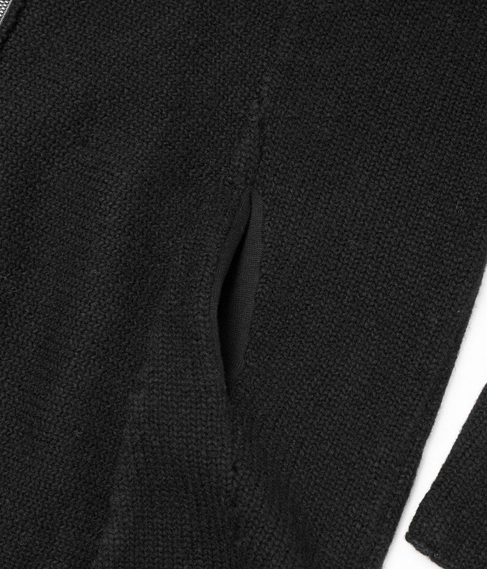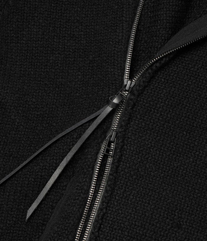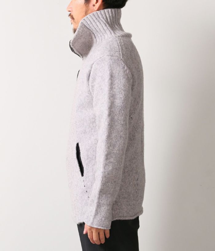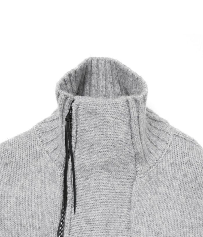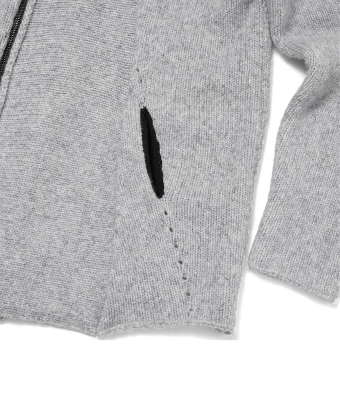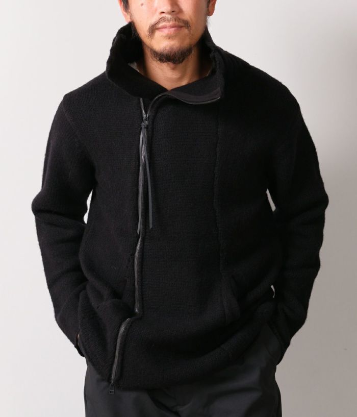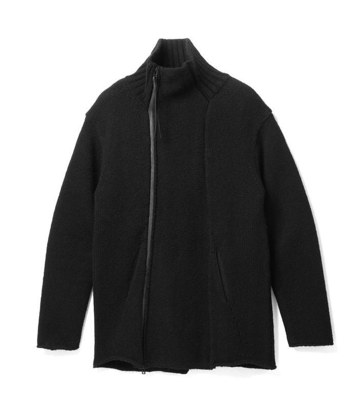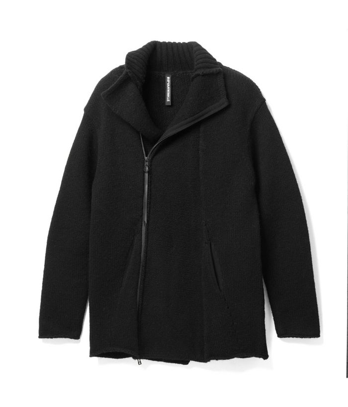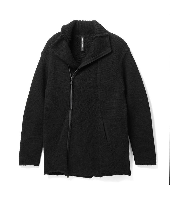 RIPがニットでライダースを提案したらというコンセプトで、布帛に劣らず完成度が高いアイテム。素材はウールナイロンの混紡糸で、膨らみと嵩高さがある3GGの天竺編。前身と後身にアクセントとなるアイレット編み、スライダートップに装着した革紐もポイントです。