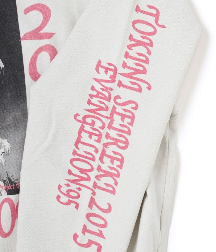 TVシリーズ『新世紀エヴァンゲリオン』から、放映当時の番宣ポスタービジュアルをデザインソースとしたスウェット。モノトーンで表現したポスタービジュアルを囲むように、存在感ある蛍光ピンクのレターでアレンジしたインパクトあるグラフィックは必見。
