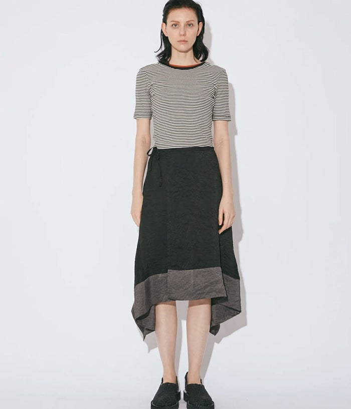 ・中間の身頃に身体を通して、クルーネックTOPをレイヤードしているかの様な着用が楽しめる