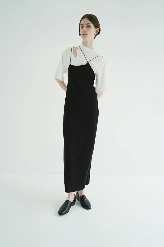 伸縮性のあるリブ素材を使用した、リブの質感と流れるようなドレープ感が魅力のストラップスカート。