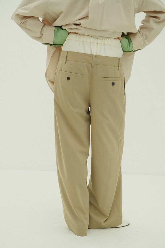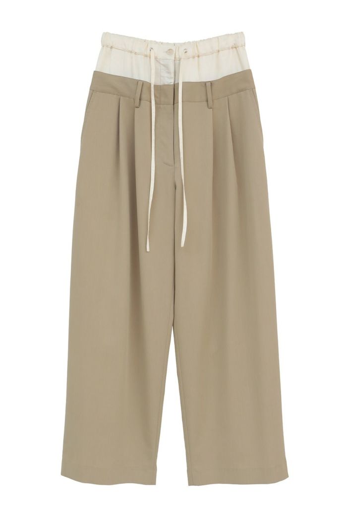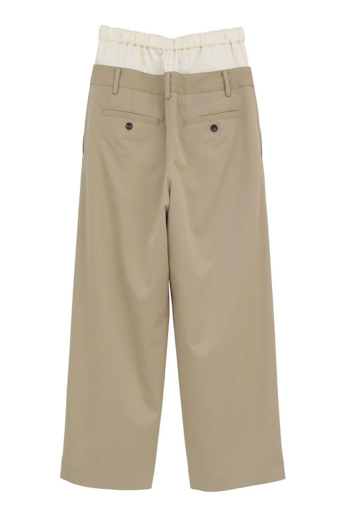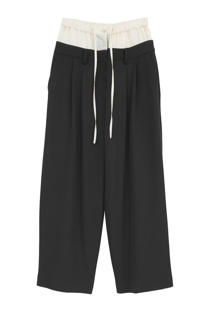 異なる2本のパンツをレイヤードし、ドッキングさせることで、一枚で映えるデザインに仕上げました。はっきりとしたバイカラーと異素材の組み合わせで、レイヤー感をより楽しめます。