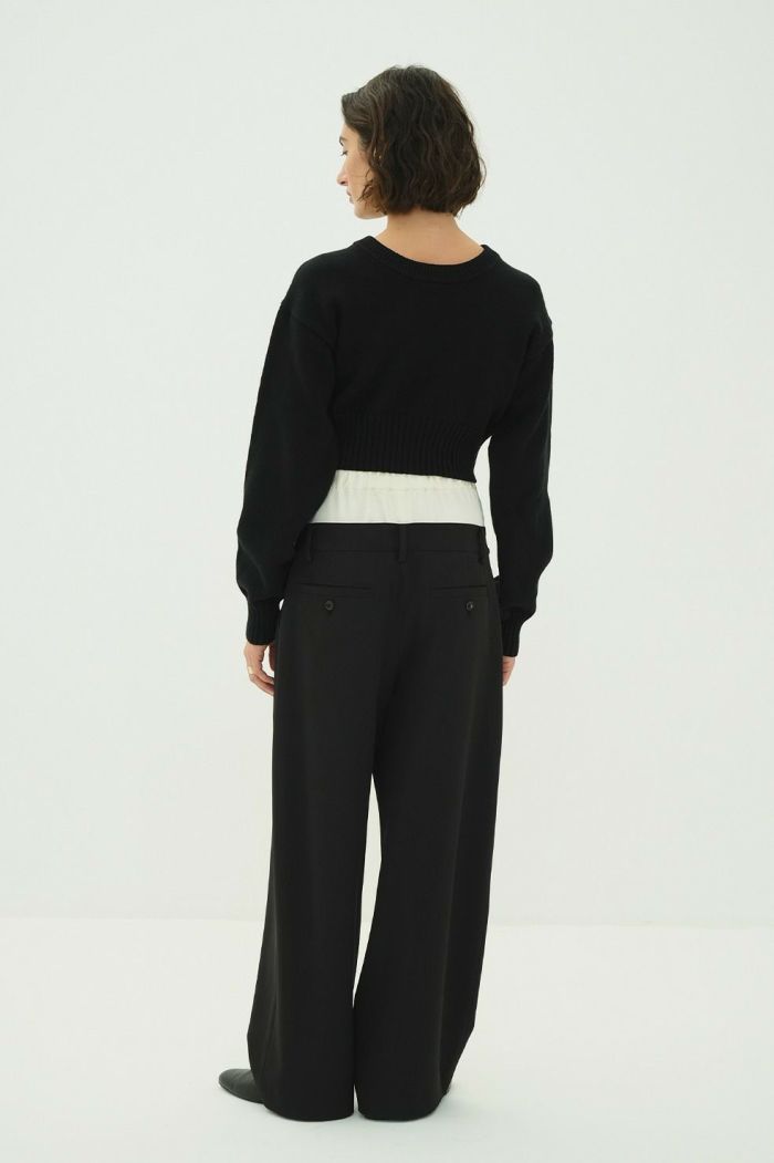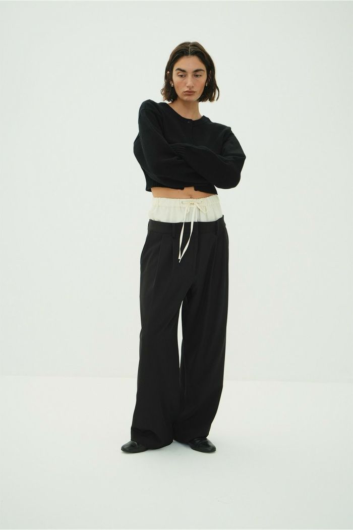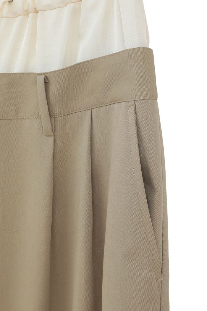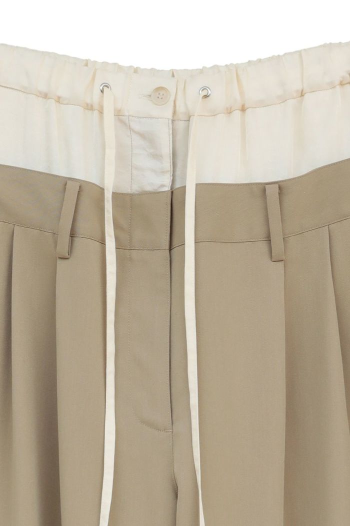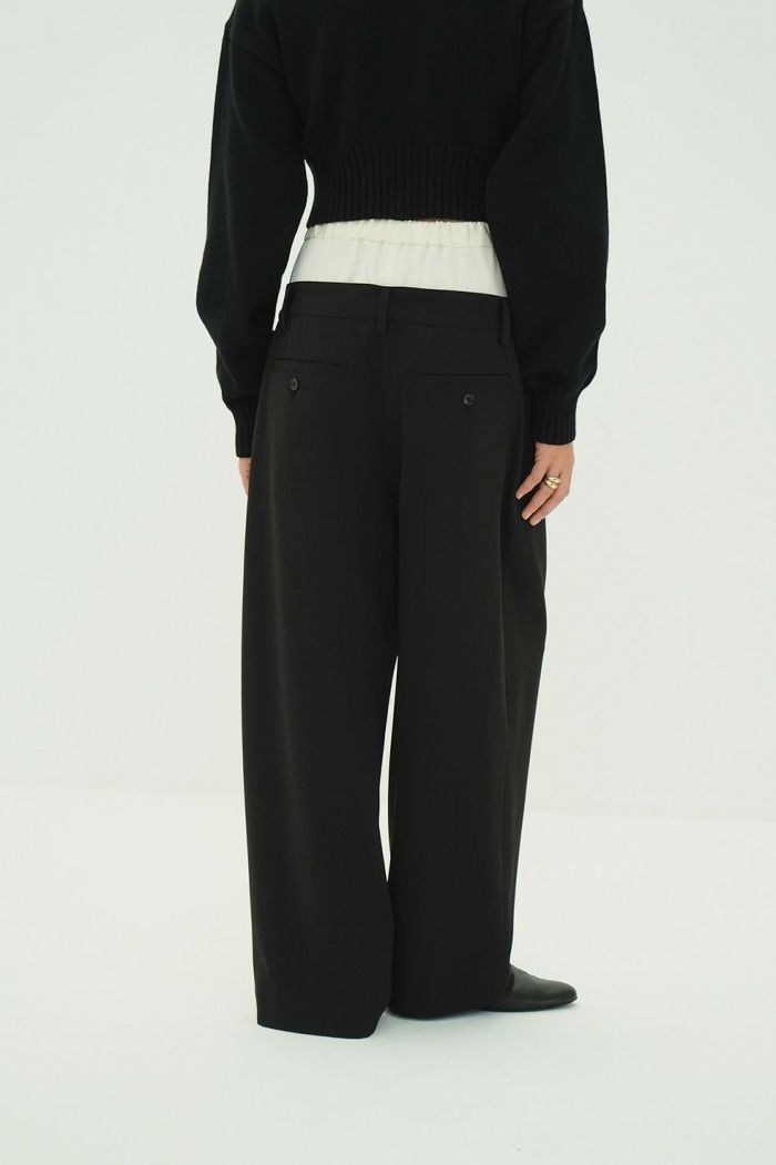 異なる2本のパンツをレイヤードし、ドッキングさせることで、一枚で映えるデザインに仕上げました。はっきりとしたバイカラーと異素材の組み合わせで、レイヤー感をより楽しめます。