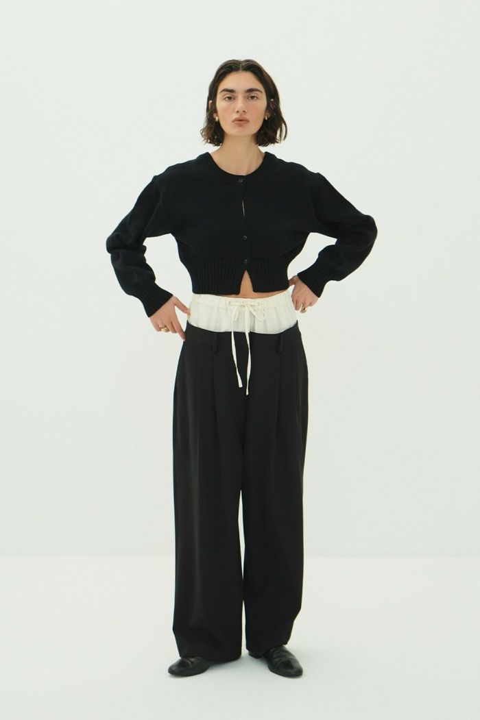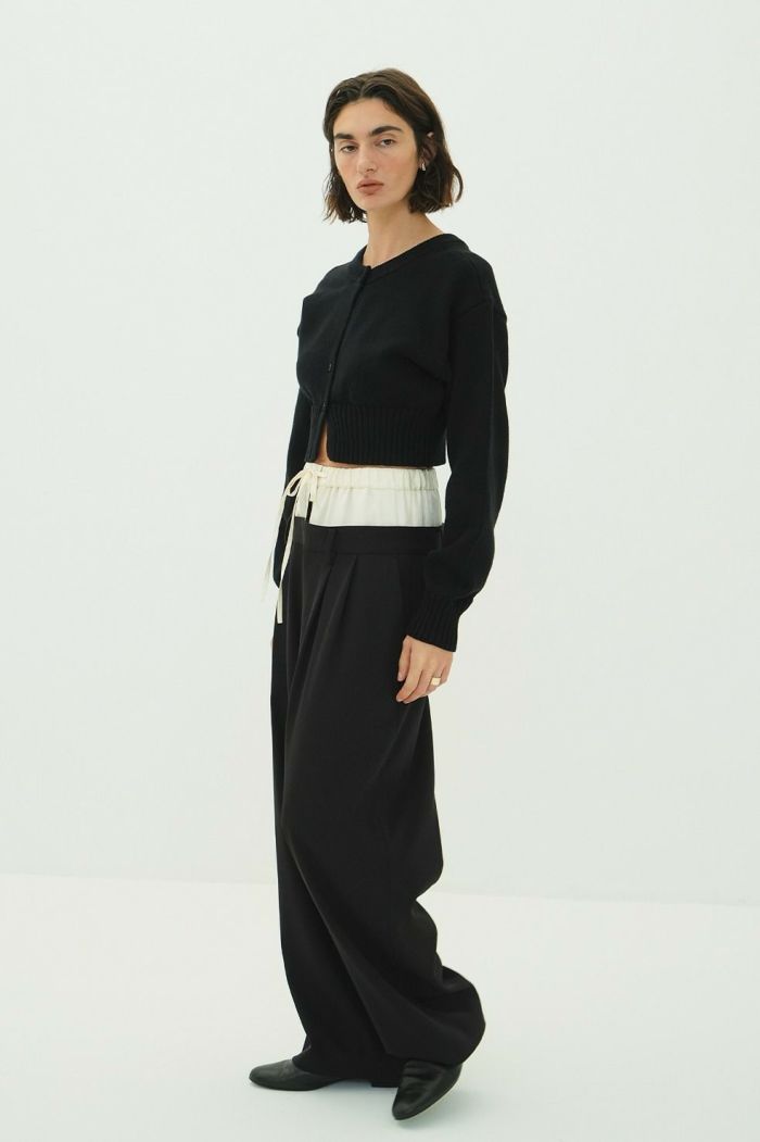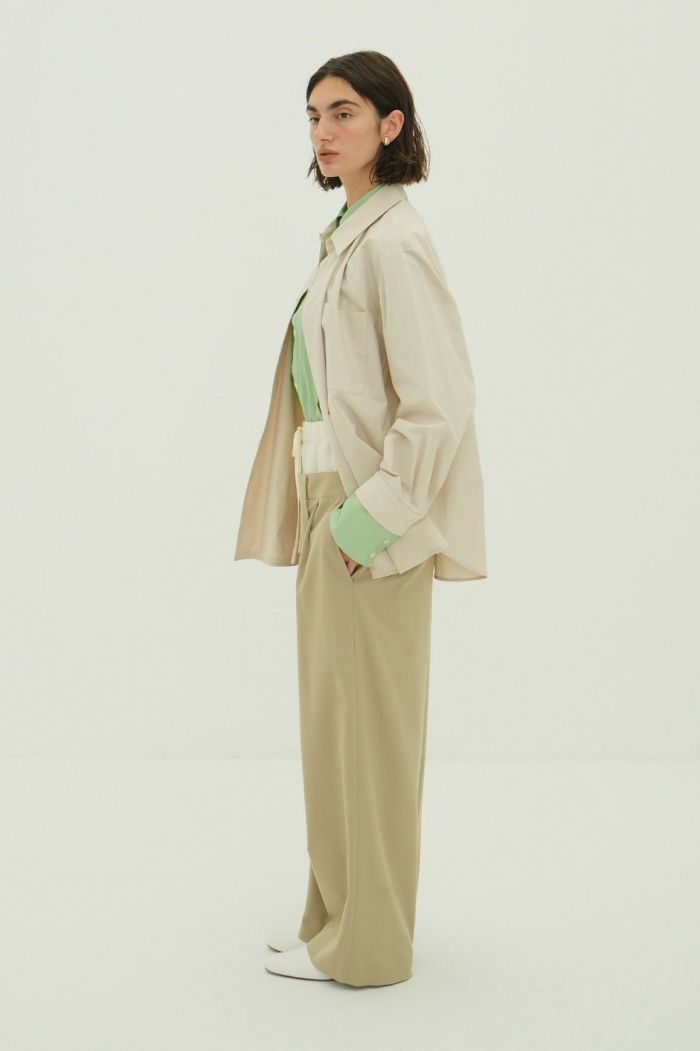 インナーパンツには艶感のある素材を使用し、上品な印象をプラス。アウターパンツはローウエストに設定し、ゆるさと抜け感を表現しました。