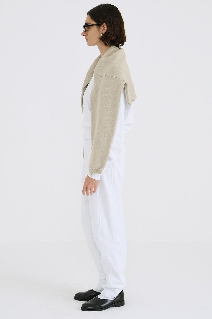 前後の脇に切り替えを入れることで、サイドシルエットをカーブラインに仕上げています。シンプルで着回しやすいデザインながら、ベーシックすぎない、CLANEらしい一本です。