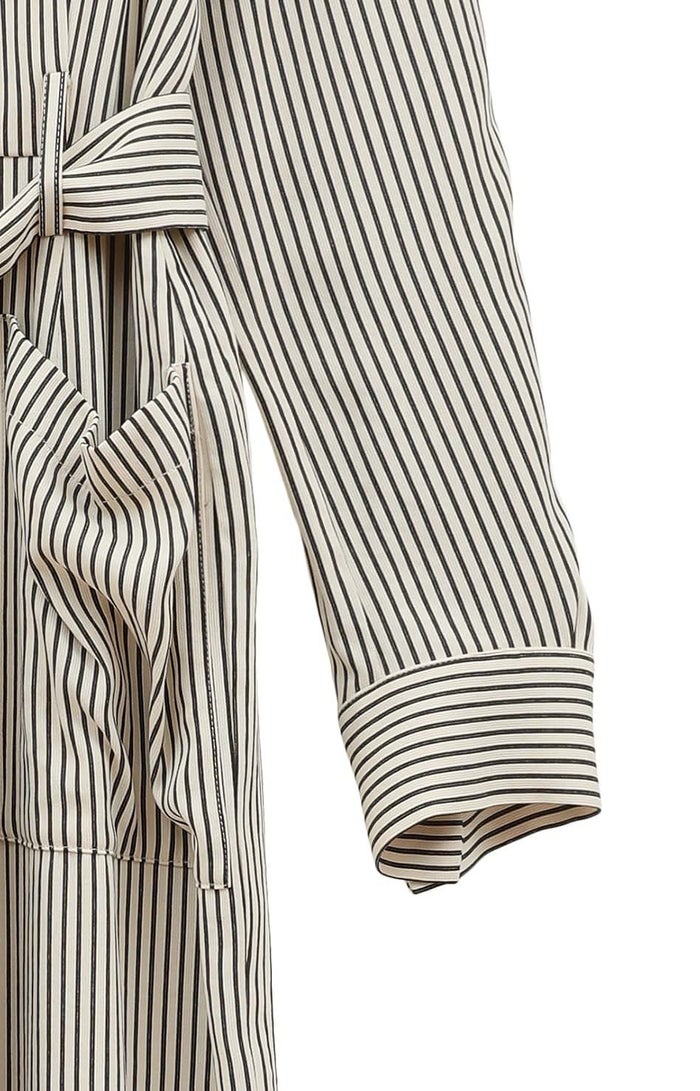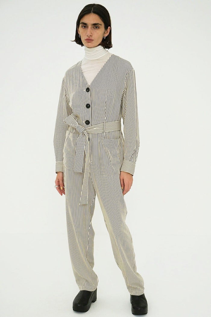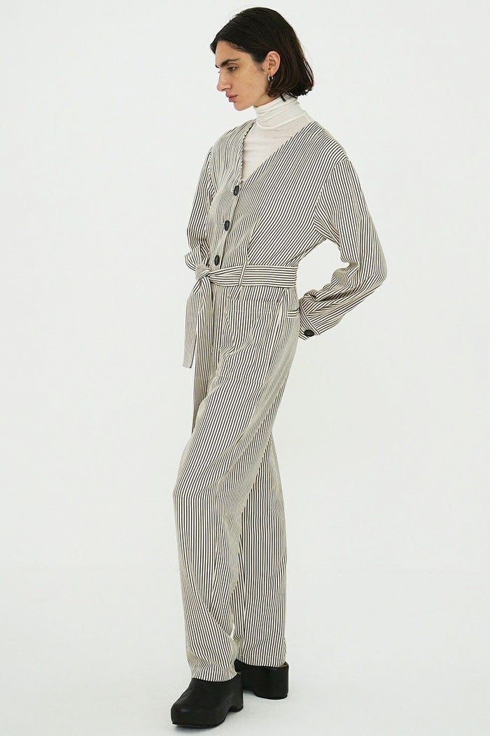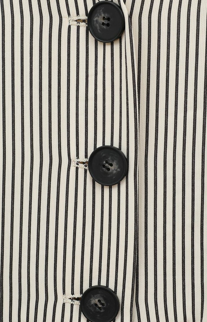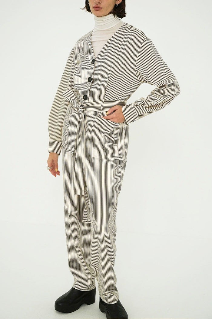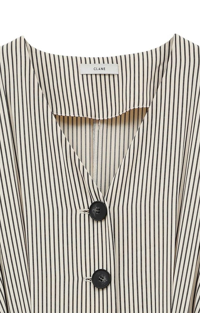 マニッシュなストライプ柄に、フロントの大きなボタンがアクセントとなり、程よいカジュアル感を演出します。深めのVネックが女性らしい印象を引き立て、バランス良く仕上げてくれます。ゆったりとしたシルエットは、付属の共布リボンでウエストをマークすることで、抜け感を持たせつつ、コーディネートにメリハリを与え、スタイルアップ効果も抜群です。