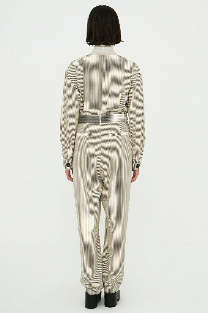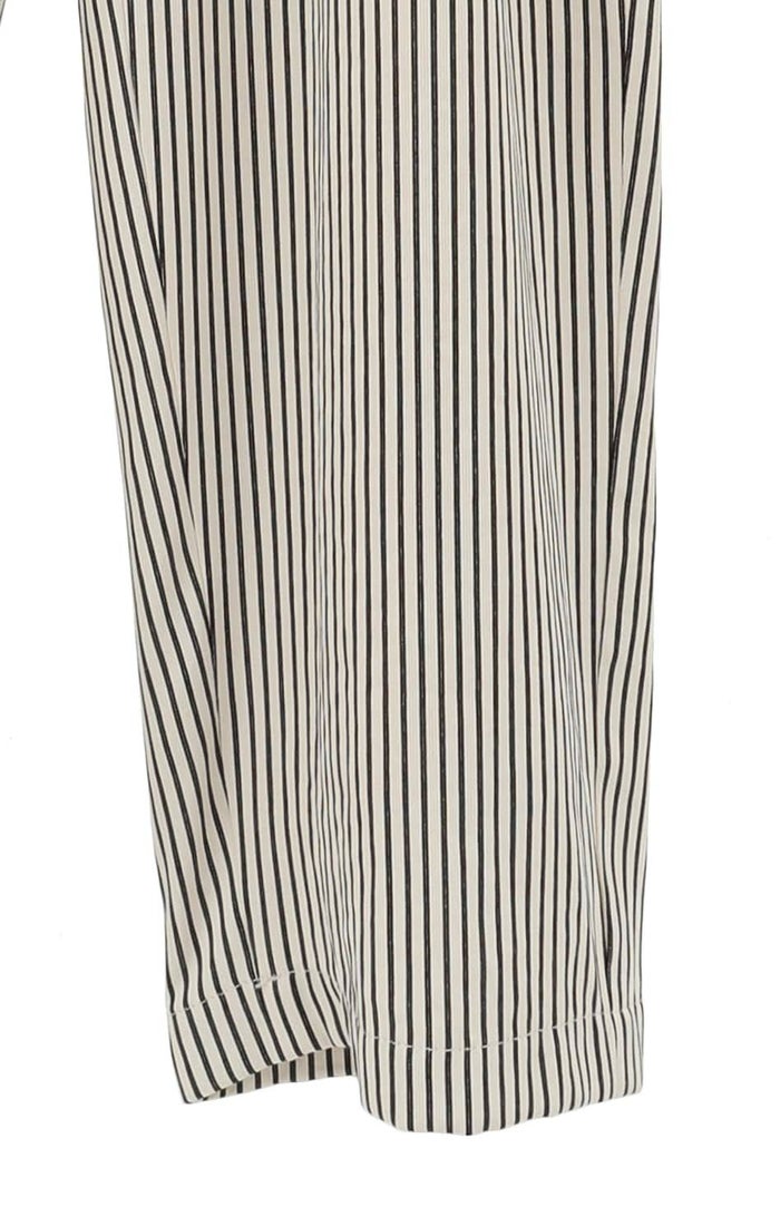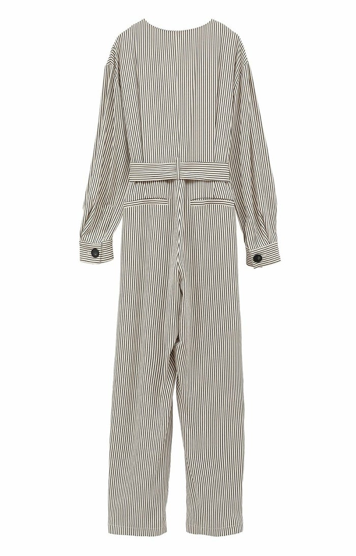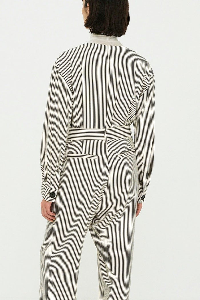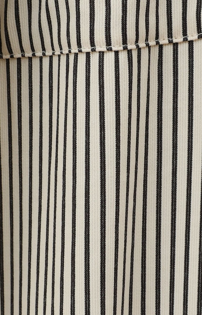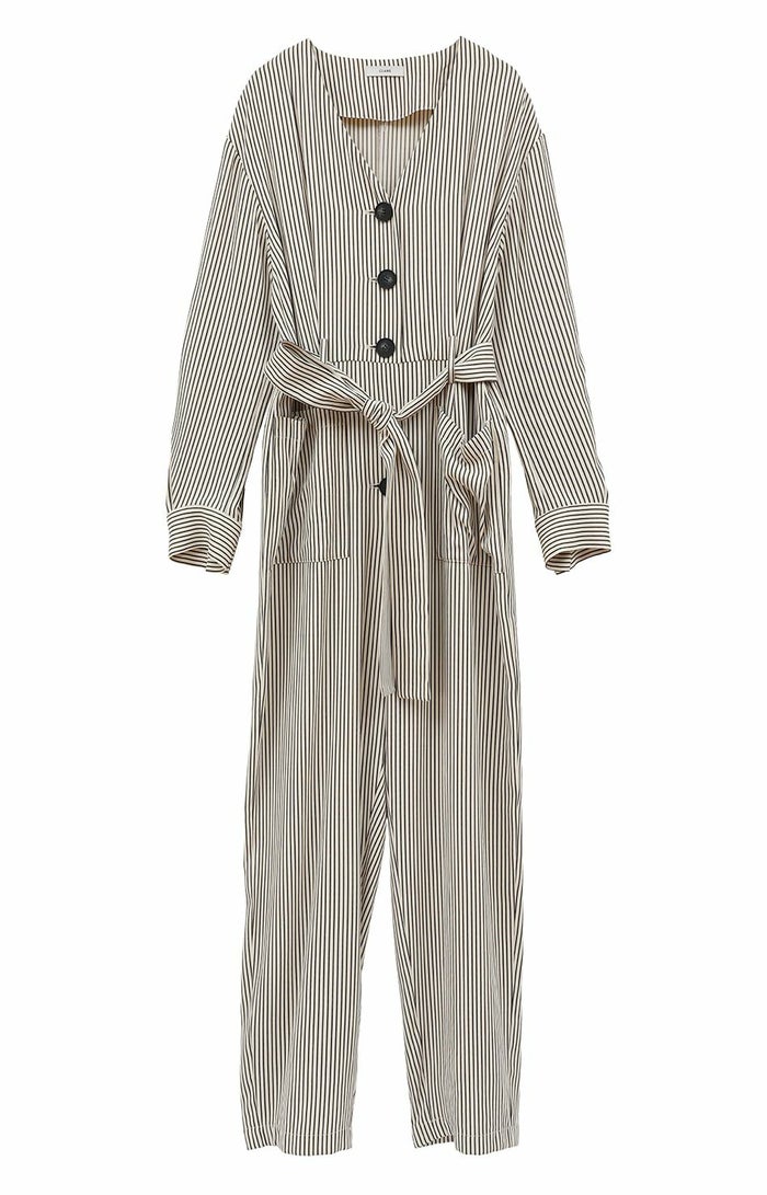 マニッシュなストライプ柄に、フロントの大きなボタンがアクセントとなり、程よいカジュアル感を演出します。深めのVネックが女性らしい印象を引き立て、バランス良く仕上げてくれます。ゆったりとしたシルエットは、付属の共布リボンでウエストをマークすることで、抜け感を持たせつつ、コーディネートにメリハリを与え、スタイルアップ効果も抜群です。