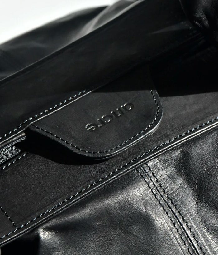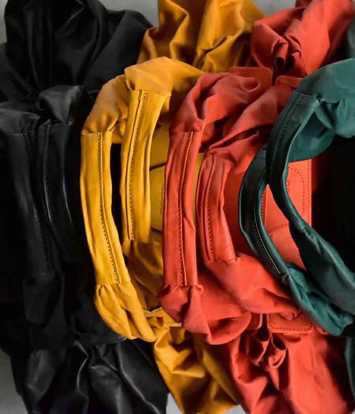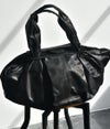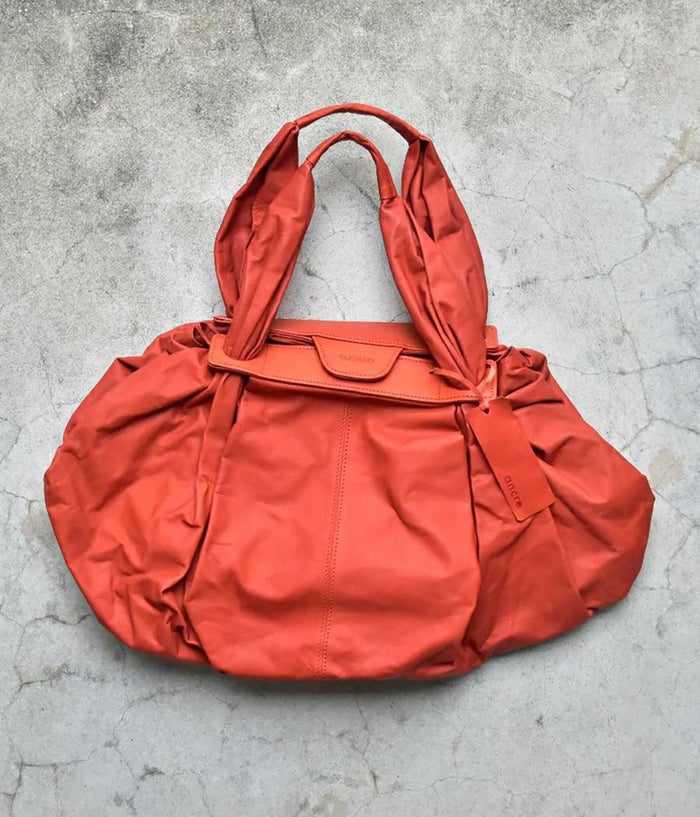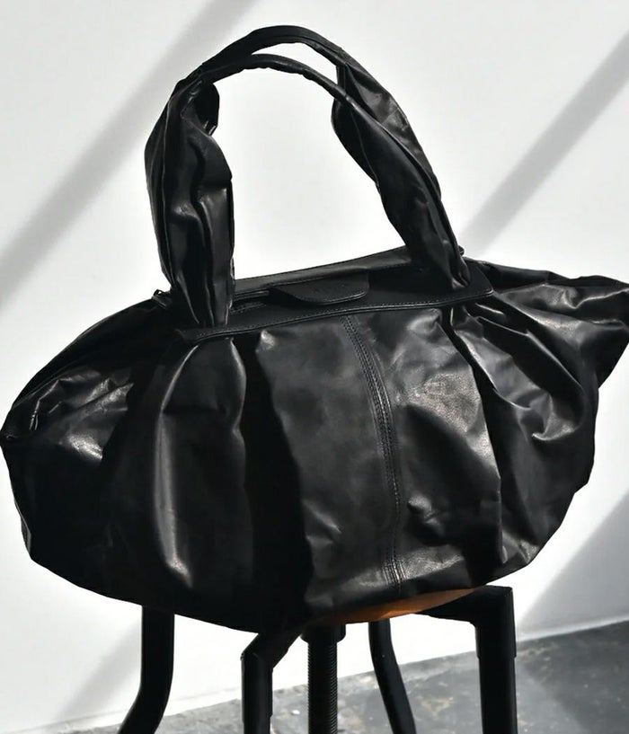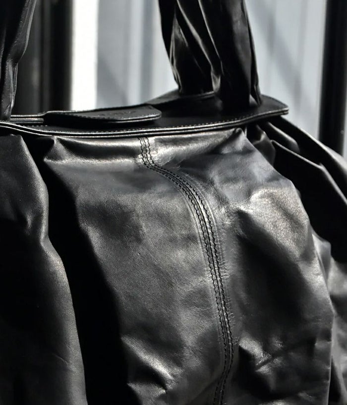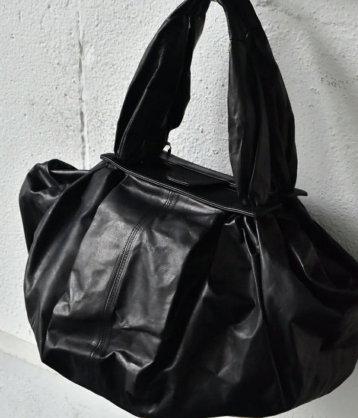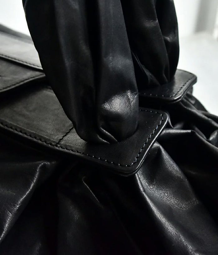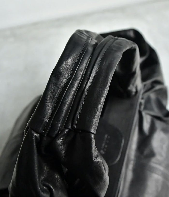 革を大胆に4枚ハギにして大きなシート状にし持ち手付け根のパーツに通し、素材のテーマである “風呂敷” を体現。一枚の革を布のように袋に出来たら、という発想から辿り着いた縫製箇所を極力無くし単純に “包む” という袋の原点に立ち返った企画。風呂敷という概念から内装やポケットなどを敢えて排除し、物をどんどん放り込みラフに使い込んで素材の経年変化を楽しんでもらいたい。マチ側のホックで留めると丸いフォルムに変化したり、オープンにして舟形の大容量のフォルムなど 表情にも変化が加えられます。バッグの中身を整理したい方は別シリーズのポーチなどで小分けにして収納を楽しめます。