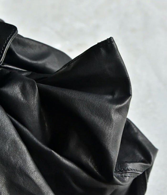 紙のような革 ... クローム鞣しの革にタンニンを多く入れ、特殊なワックスをブレンドし手作業でワックスを塗りこんで仕上げた特殊素材。 最後に薄く漉きを入れることでサラッとした紙の質感や張り、コシ感を持たせ薄く紙のように形状維持が可能な まさに【折り紙】の様な折れる革を実現したシリーズ。0.5mm に漉きを入れ折り紙を折るように畳んだり返したりして出来る自然なドレープや艶がこの革の持つ繊細さを表現しています。 金属パーツを極力使わずにセンターでクロスさせた風呂敷のような構造の見え方や自然なシワ加減など和紙で 紙袋を作るイメージがデザインソース。