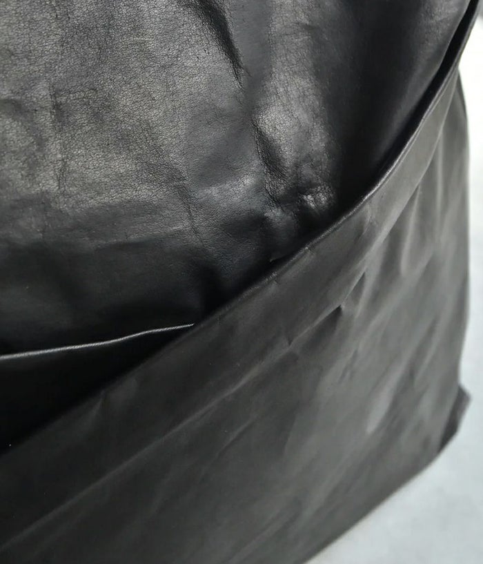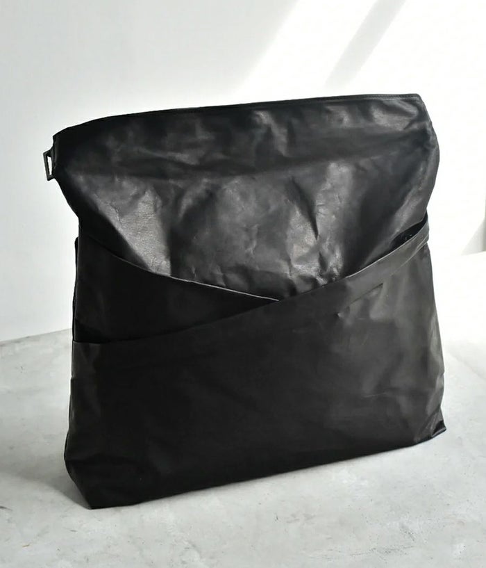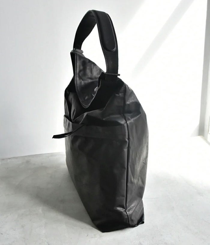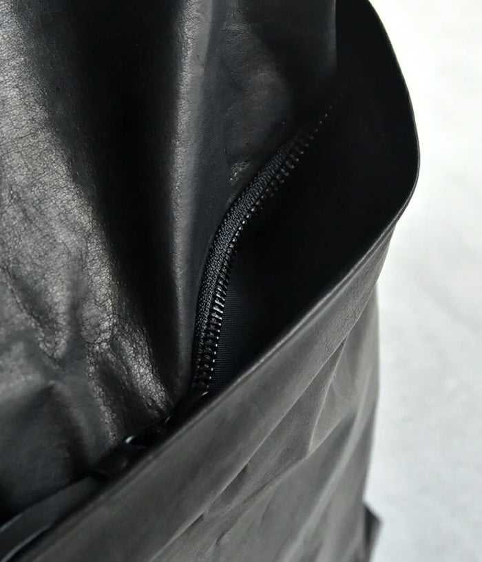 紙のような革 ... クローム鞣しの革にタンニンを多く入れ、特殊なワックスをブレンドし手作業でワックスを塗りこんで仕上げた特殊素材。 最後に薄く漉きを入れることでサラッとした紙の質感や張り、コシ感を持たせ薄く紙のように形状維持が可能な まさに【折り紙】の様な折れる革を実現したシリーズ。0.5mm に漉きを入れ折り紙を折るように畳んだり返したりして出来る自然なドレープや艶がこの革の持つ繊細さを表現しています。 金属パーツを極力使わずにセンターでクロスさせた風呂敷のような構造の見え方や自然なシワ加減など和紙で 紙袋を作るイメージがデザインソース。