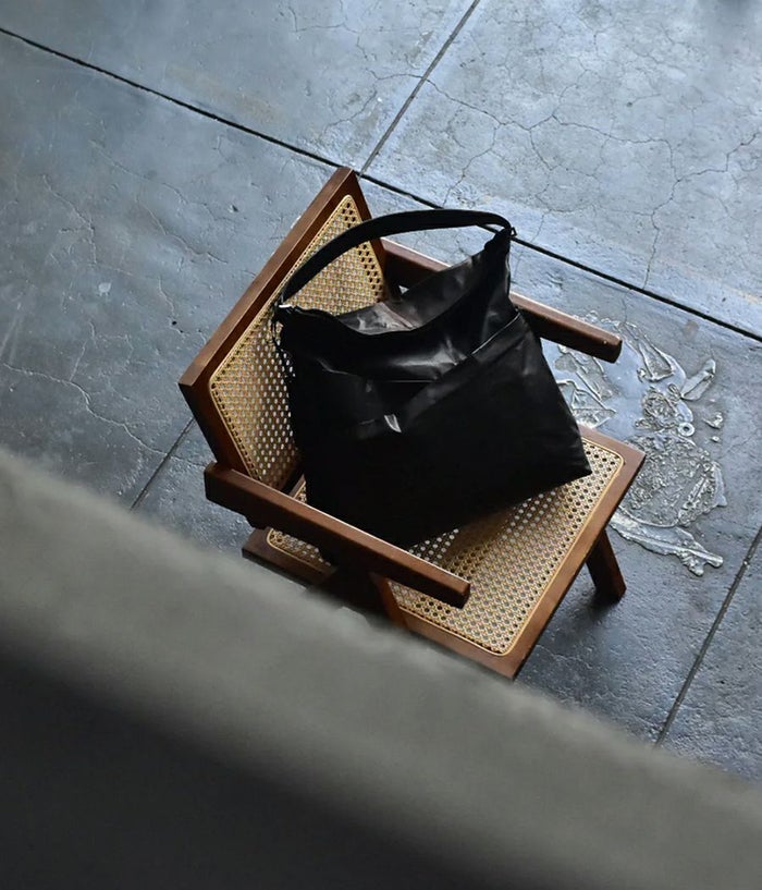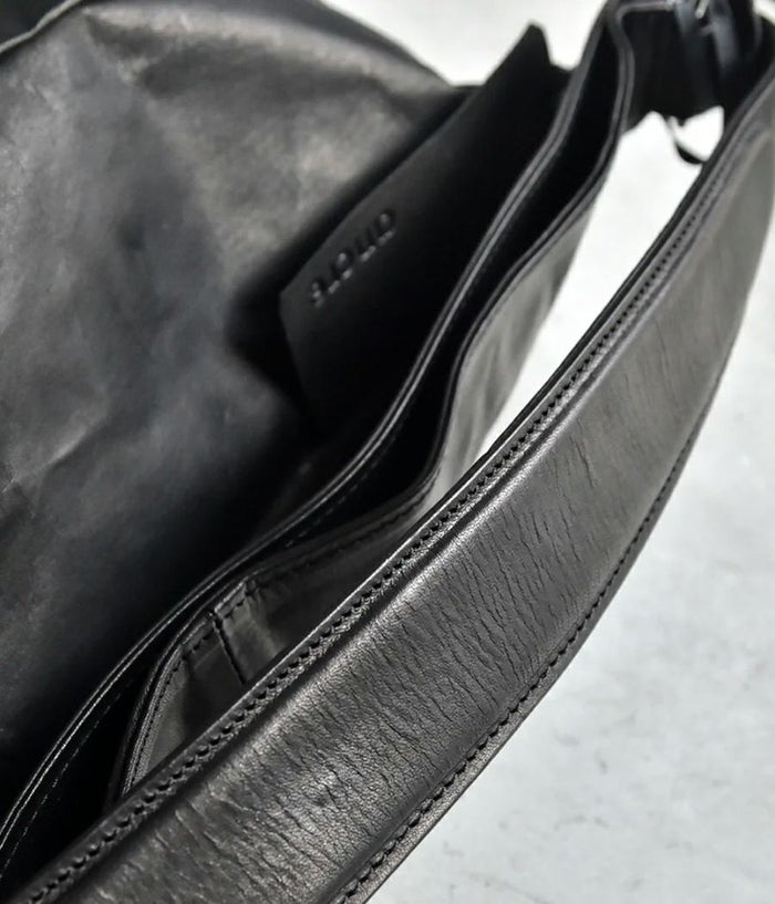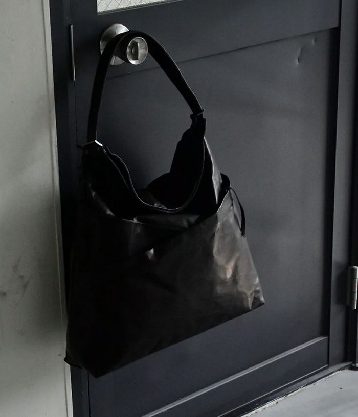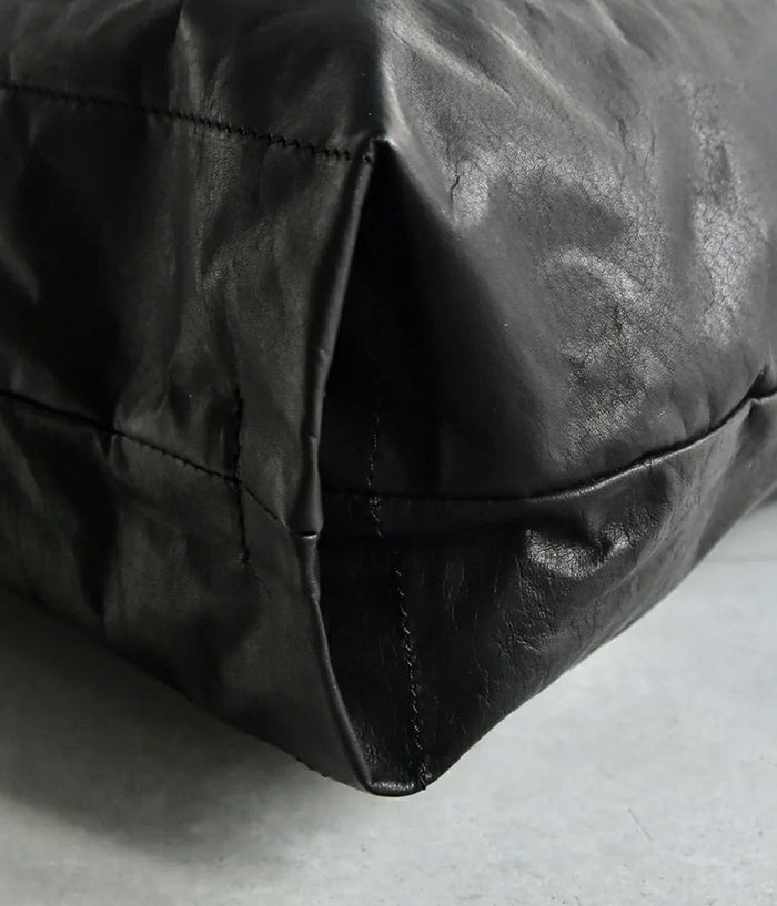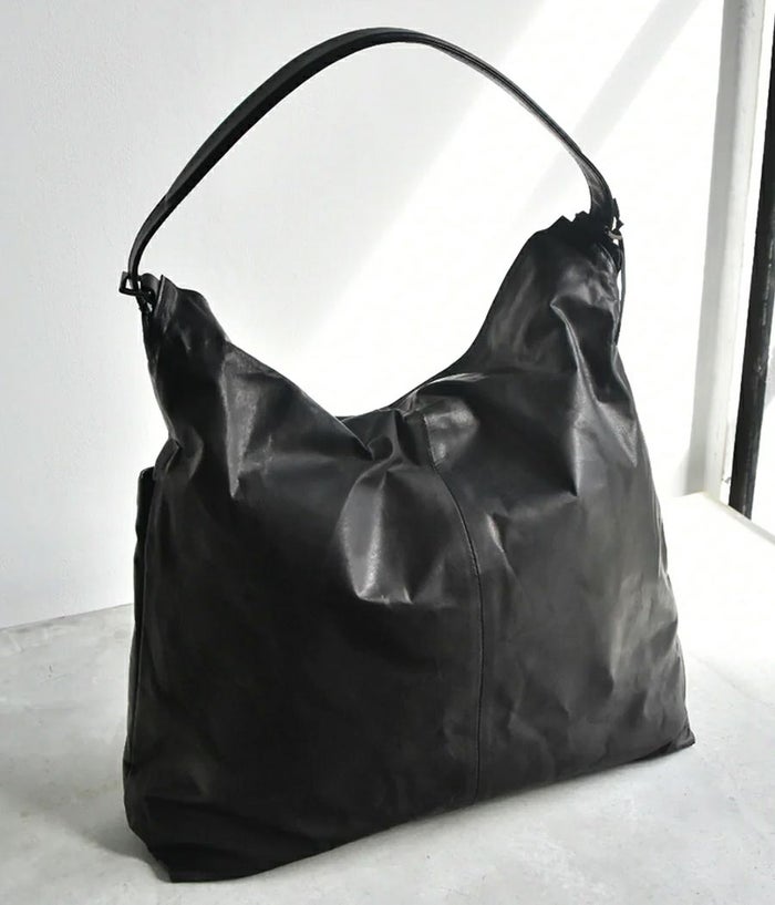ざっくりとした大振りなワンショルダーで持った際に、口元が折れて自然なドレープがよりフォルムを引き立たせる。裏地にキルティングを用い、革の薄さを綿で補強し、ふっくらとしたボリュームで自然なシワ感を表現。斜めに走るファスナーポケットや小物類を収納できるポケットなど、実用性も兼ね備えつつ金属部分を極力排除し素材の特徴をより引き立たせる仕様に仕上げています。