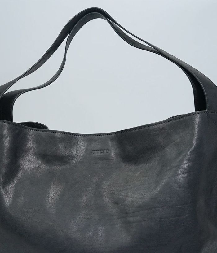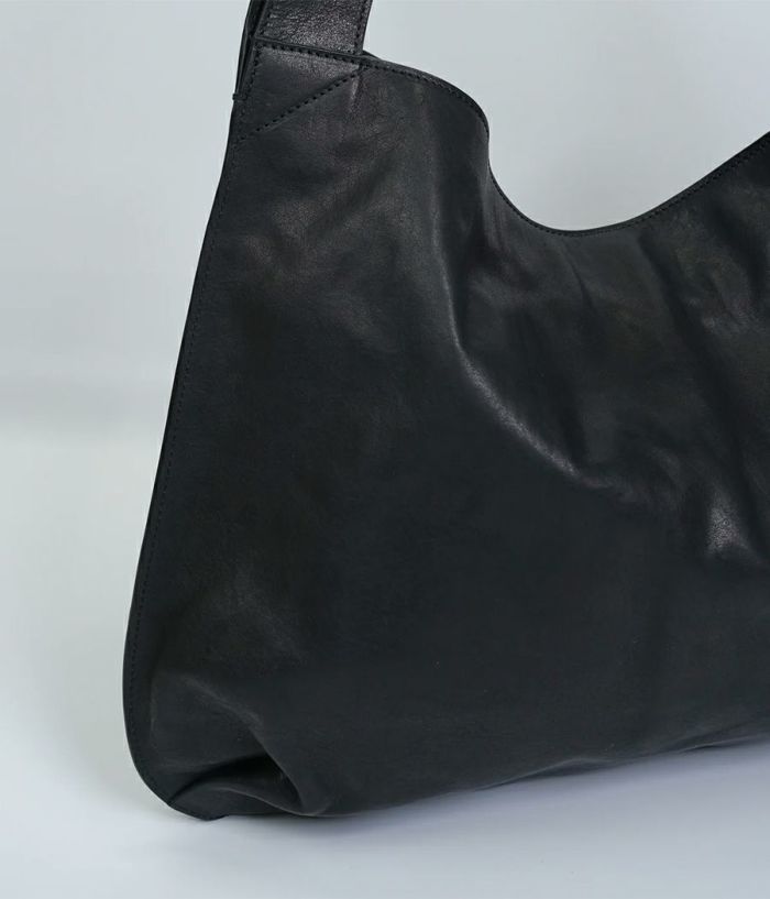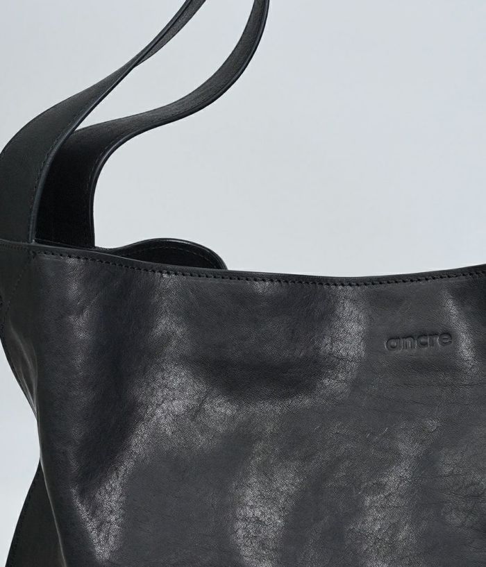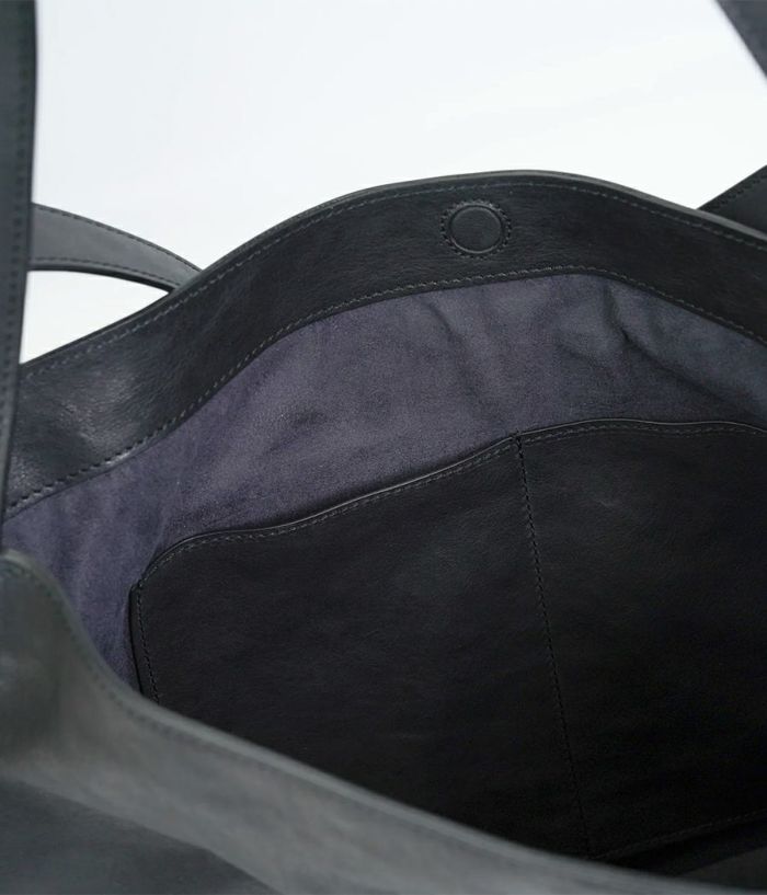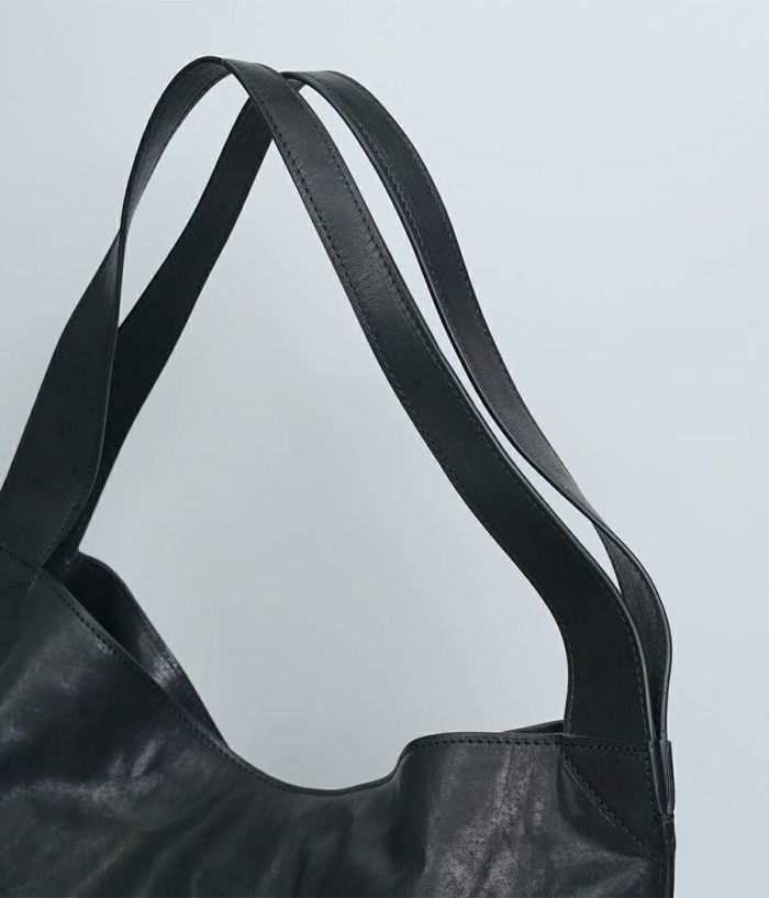 革の素材を最大限引き出した大振りな革袋。ざっくりとした作りにも内装に仕切りポケットが二つ、ファスナーポケットを装備し小物を仕分けして収納が可能。持った時に口元が折れて独特なフォルムを醸し出し、持つ人の感性が試されるバッグ。