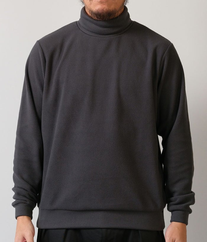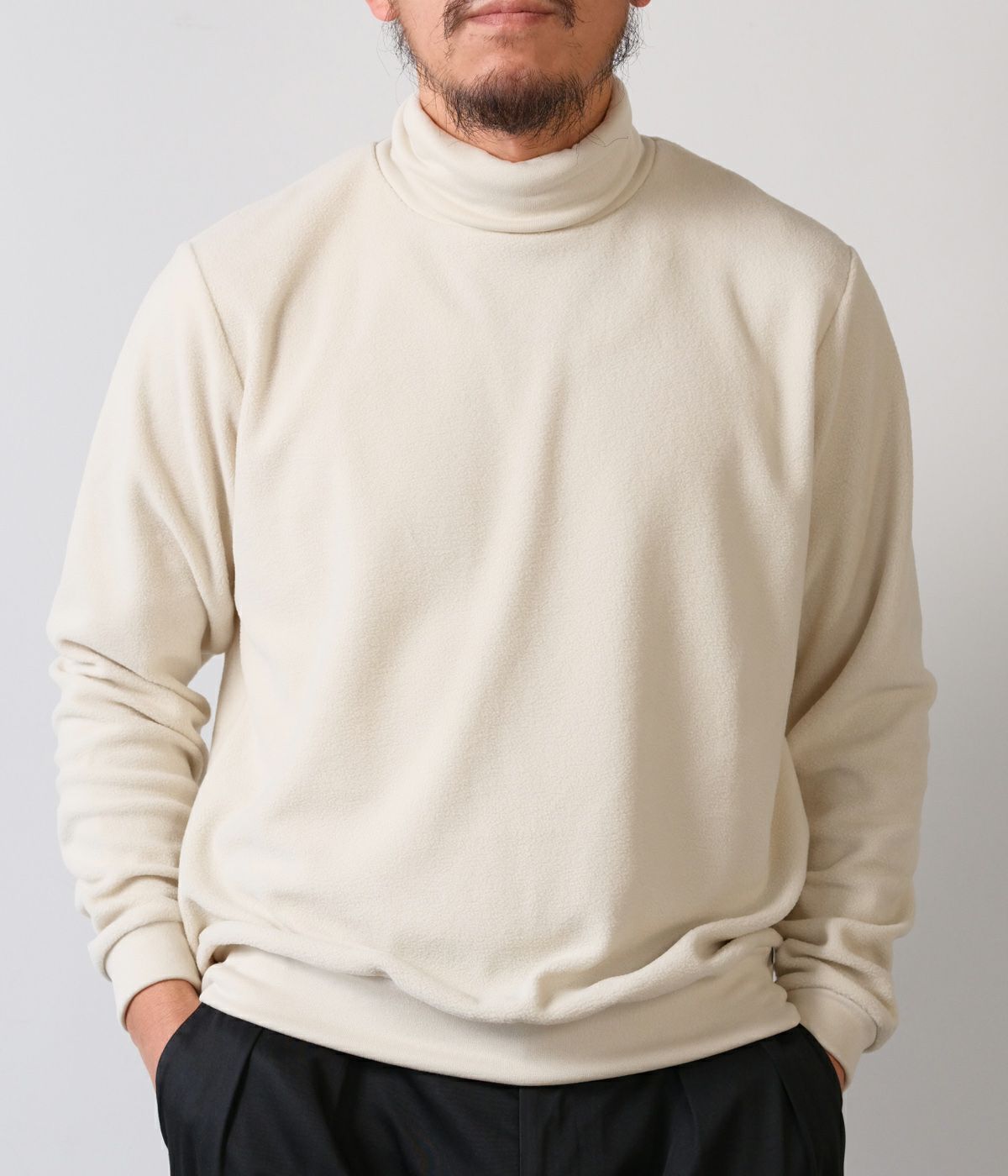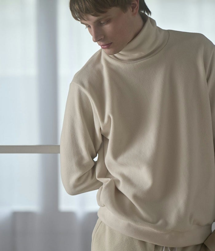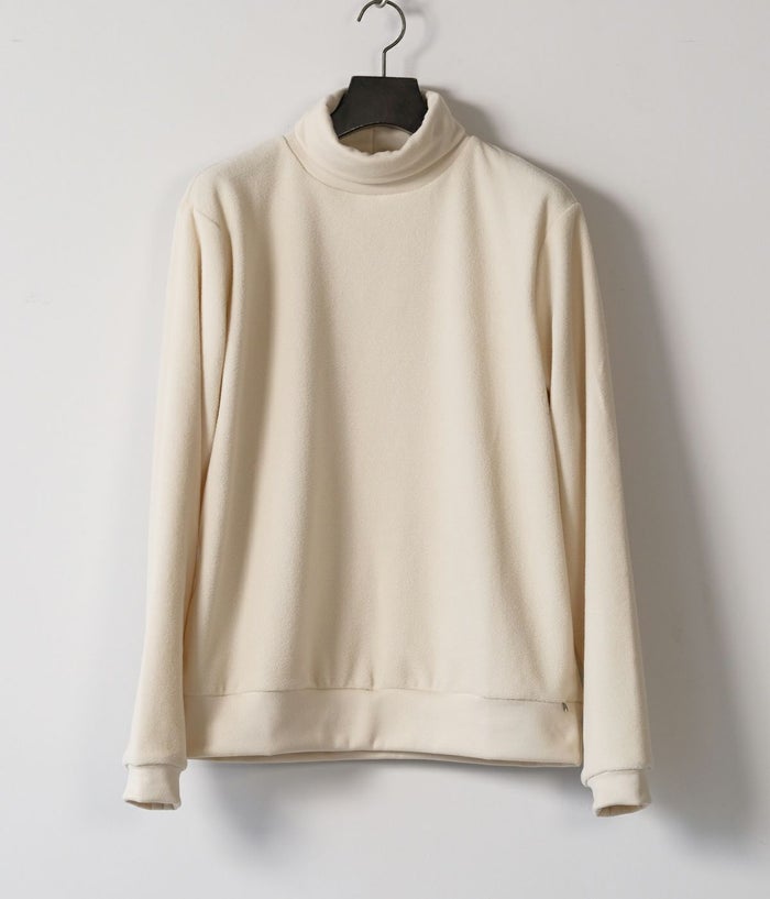 形は定番のオフタートル。しかし素材は新素材になります。着用時の心地よさが非常に良くセレクトさせて頂きました。少し肌寒くなってきた季節からはこちらがオススメです。ピタピタすぎないので1枚で着用下の時のバランスも綺麗です。