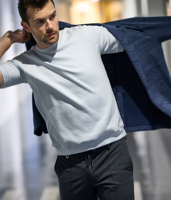究極の肌触り、着ているだけで心地よく、優しい風合いのジャージを実現させるため、原料から紡績、撚り方法、染色から仕上げまで全ての工程にこだわりを詰めた素材。最近では認知度も上がってきている“インド最高級稀少綿のスビンコットン”と“超長綿の代表的な品種DCH32”の二種を混紡し、超長綿100%のオリジナル糸を作成。スビンコットンだけではとろみが出過ぎてしまうこともあり、敢えて混紡糸を採用しています。紡績も通常糸ではできない超甘撚りに仕上げて、原料がもつポテンシャルを最大限に活かした配合と撚り具合の糸にしているのもポイント。編みは丸編みの産地で有名な日本の和歌山でスポーツ系ジャージ素材で多用されるテクニック<4段スムース組織>を採用しました。何層にも重なったような組織をもち、通常のスムースと比べて膨らみと弾力が魅力なポイントとなります。仕上げも和歌山で特殊加工を施し、花びらのようなきめの細かさ、しっとりとした風合いを助長させて、包まれるような心地の優しい素材に仕上げました。編み立てから染色、仕上げ、縫製まで一貫してジャパンメイドにこだわったNEW JERSEY が生まれました。