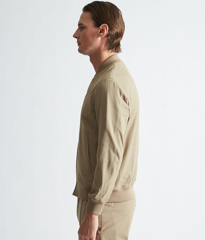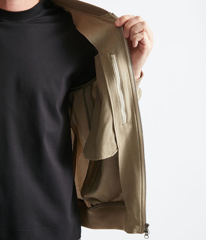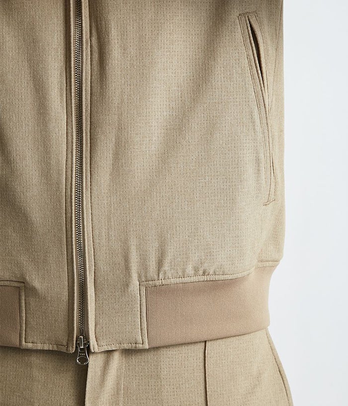 定番アイテムであるMA-1をメッシュ調の高機能素材を採用し、優れた通気性と快適性を備えたブルゾンに仕上げた。 過度なデザインを省きながらシャープな印象になるディティールを組みこんだ工夫しています。 シルエットやレングスはコンパクトにまとめ、細身のパンツにも相性がよいサイズ感になっている。 衿リブや袖も細めに設計し、野暮ったくならない顔になっています。 一枚羽織るだけでスタイリングが完成する汎用性に加え、同素材のパンツとのカジュアルなセットアップもおすすめです。 暑い時期にも快適に着用でき、コーディネートに悩まず活躍する一着です。