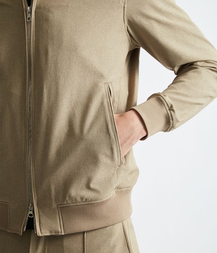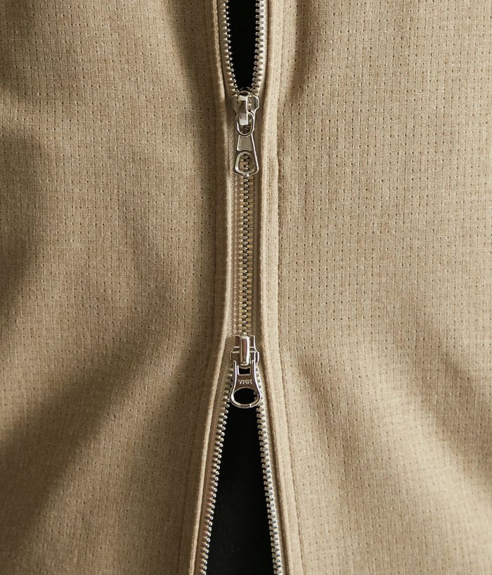 東レの「Primeflex」と「DotAir」を組み合わせた高機能素材を採用。 優れたストレッチ性と通気性を兼ね備え、春夏シーズンに快適な着用感と高いパフォーマンスを発揮します。 DotAirの特殊なメッシュ組織により、軽量で肌離れが良く、涼しくドライな着心地を実現。 さらに、杢調の奥行きある表情が上品な雰囲気を演出します。 機能性と表情の豊かさを両立した、現代的なテキスタイルです。