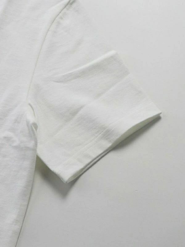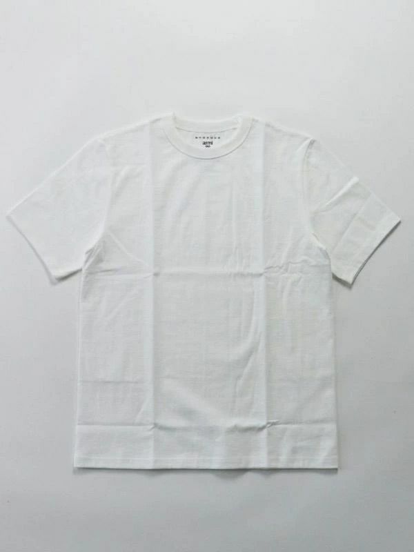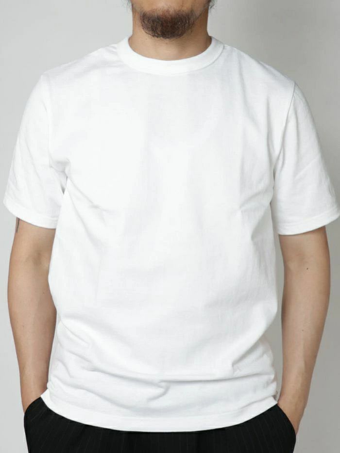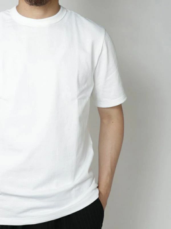 耐久性とドライな質感が特徴の吊り編み度詰め天竺。詰まった首元とすとんとした丸胴でゆったりとしたカジュアルなシルエットの丸首Tシャツです。
