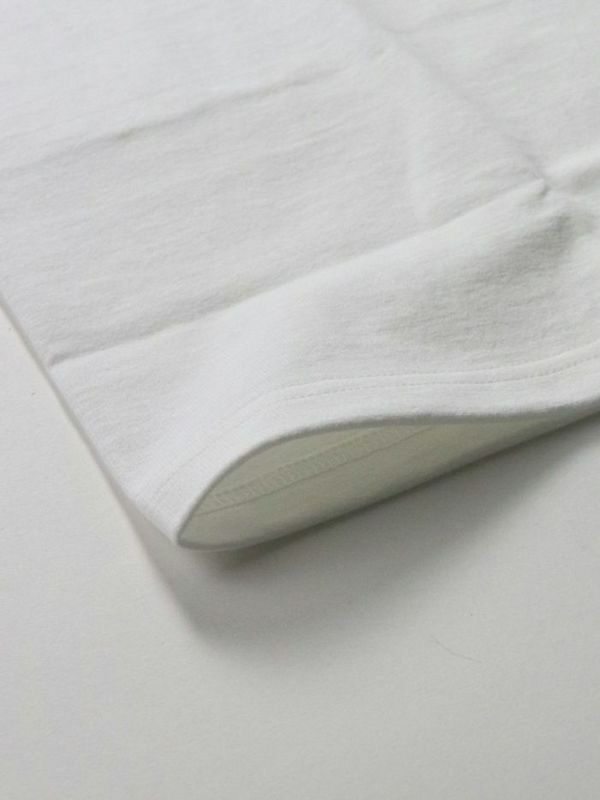 表20番/裏30番の両面編みという非常に珍しい糸使いの生地。 使用している空紡糸は空気圧で撚り合せている構造上、表はしっかり、中央は甘く柔らかいのが特徴で、肌触りはドライでさらっとしながらも、着用するとふっくらとしたボリュームも感じられ、吸汗性と速乾性に優れています。 肉厚な度詰めヘビーウエイトの丈夫さに加え、吊り編み機により糸にかかる余分な力が軽減される為、型崩れが起きにくいのも特徴です。仕上げには生地へのタンブラーをかけているので、ご家庭でのお洗濯も安心。 使うほどに肌に馴染んでいく、長くご愛用いただけるTシャツです。