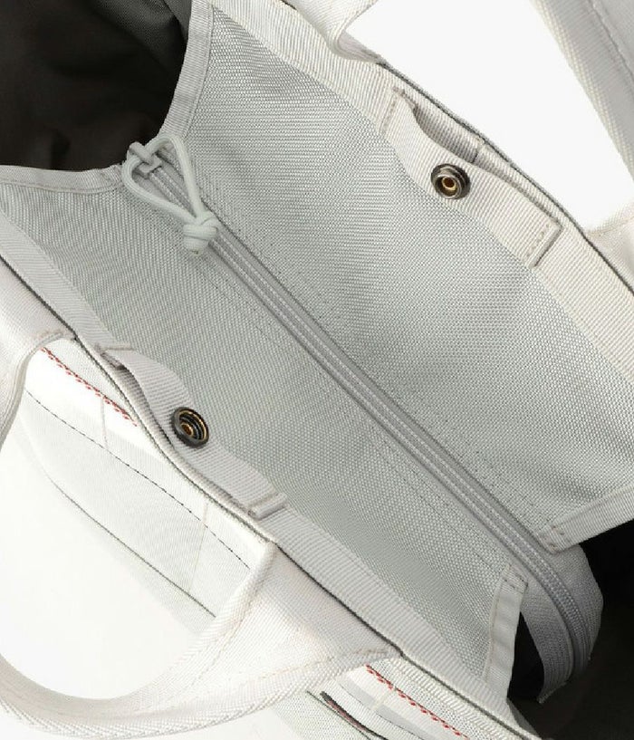 ・開口部は天蓋付きファスナートップ仕様で、中身が見えない構造に。さらにはスナップボタンを配置し、荷物の容量感によって留め方を変えることが可能。