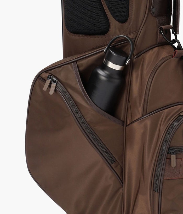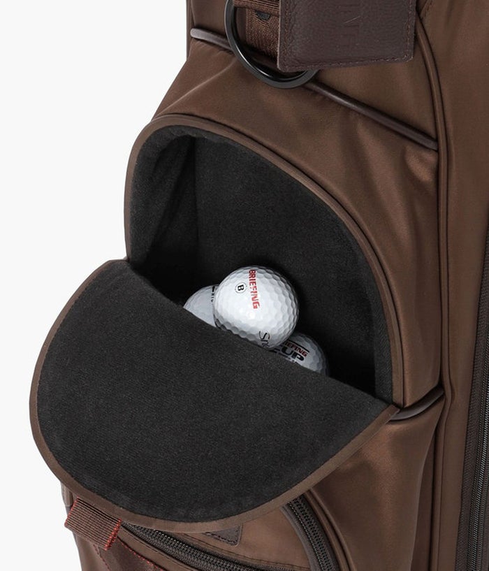 ・レインウェアなどの嵩張るアイテムの収納に便利な大型ポケット、ゴルフボール1ダースを収納できるポケット、保冷機能を備えたボトルポケットなど多数配置。