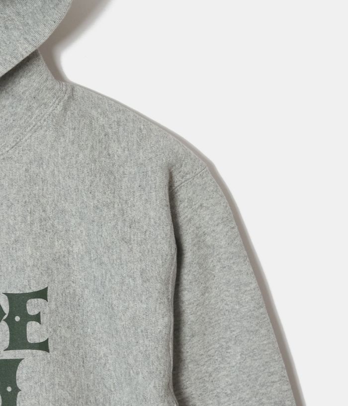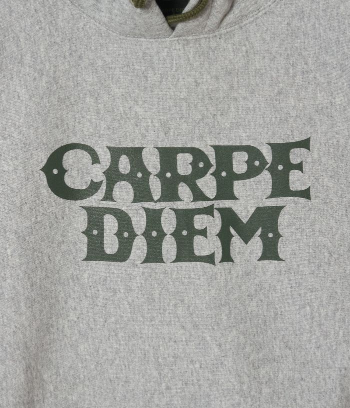 そのコットンにもオープンエンド糸を使う事で古き良きアメリカを思わせるざっくりしたドライな表情を持たせています。しかも12オンスと言うヘヴィーウェイトな素材に裏起毛も施している為もはや上着要らずなボリュームに。そのボリューム故フードの立ち方も秀逸です。更にCARPE DIEMの2段ロゴをブランドカラーのカーキに統し、フード紐もそのカーキグリーンに合わす事で全体のバランスを整えています。