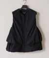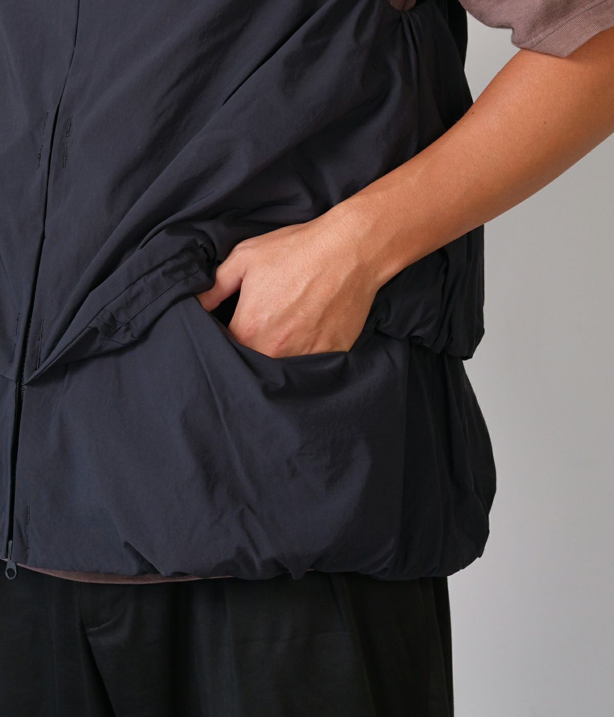2重の裾ギャザーの間にはスラッシュポケットとZIP付ポケットを配置。