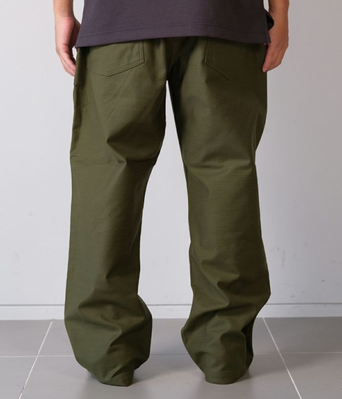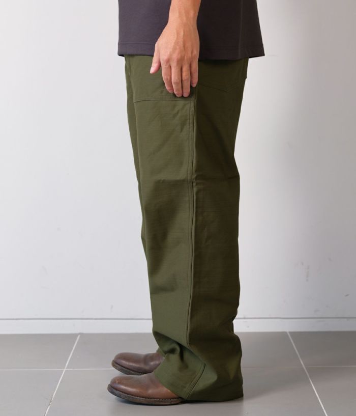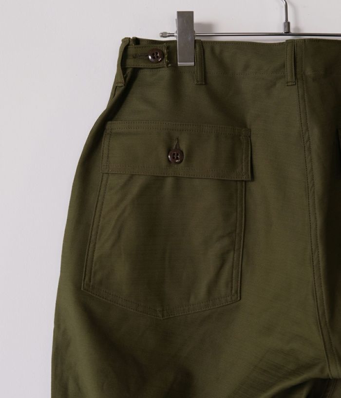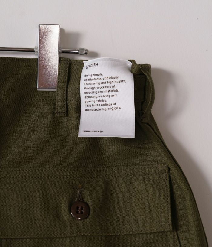 CIOTAのベイカーパンツの中で最も太い、バギーシルエットモデルです。生地はミリタリーウェアの定番素材、バックサテン。試作を繰り返してようやくたどりついた、オリジナルのムラ糸で織り上げました。タテ糸、ヨコ糸ともに、スビンコットン100%なので、高密度ですが、ソフトな風合いで肌触りはなめらか。洗うほどに柔軟さは増し、表情豊かに。経年変化も楽しめる素材です。デザインとディテールは、アメリカ軍が1950年代頃に採用していた、ウエストの帯部分が一枚仕立ての希少なモデルをサンプリング。サイドアジャスター付きで、フロントはボタンフライ、尿素ボタン、アウトサイド及びインサイドのシームはダブルステッチ。