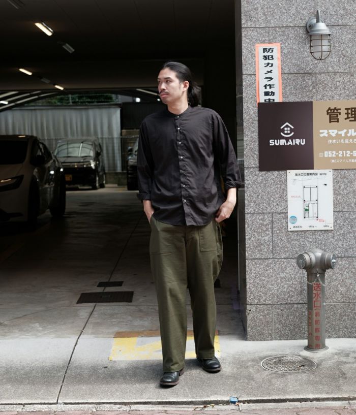 CIOTAといえばの代表格の1つとも言えるベイカーパンツ。今回セレクトしたDARK OLIVEはまさに軍物の雰囲気が強区出ていますがこだわりつくされたオリジナルファブリックはエレガントな雰囲気に落ち着きました。軍モノ感があり太めのシルエットですが無骨すぎない印象なのがCIOTAの魅力。
