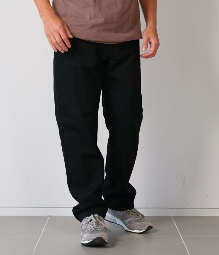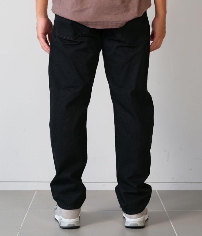 定番として展開し続けてきたテーパードモデルがフルリニューアルしました。生地は、のり抜き、防縮、斜行止め、毛焼きなどをしていない“生機”に変更。縮みやよじれが起こりますが、デニム本来の質感、経年による表情の変化を楽しめます。膝から裾にかけて緩やかに細くなったテーパードシルエットは、これまでよりもやや太めに変更。1970年代のヴィンテージジーンズをサンプリングしていて、ファスナーは42TALON、ポケット裏はシングルステッチ、バックポケットの形はやや細長いデザイン。ブラックとグレーデニムはタテ糸に硫化染料によるロープ染色の中白糸を使用。ヨコ糸はどちらも超長繊細綿・スビンコットンを使い、旧式力織機(シャトル織機)でセルビッチデニムに仕上げています。