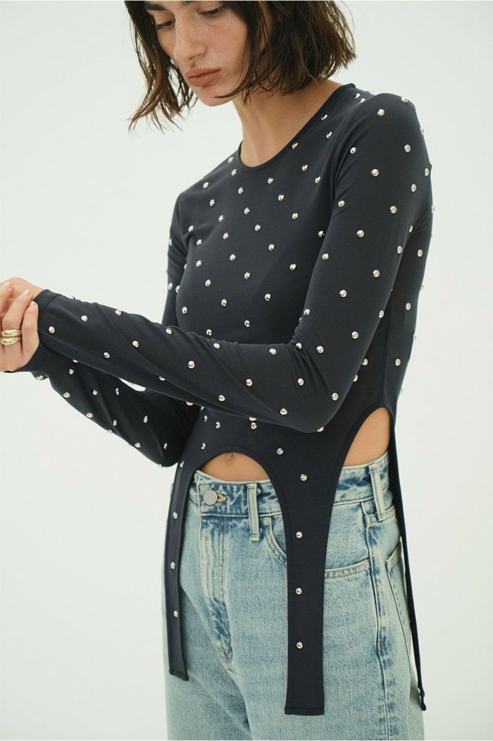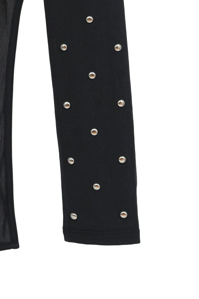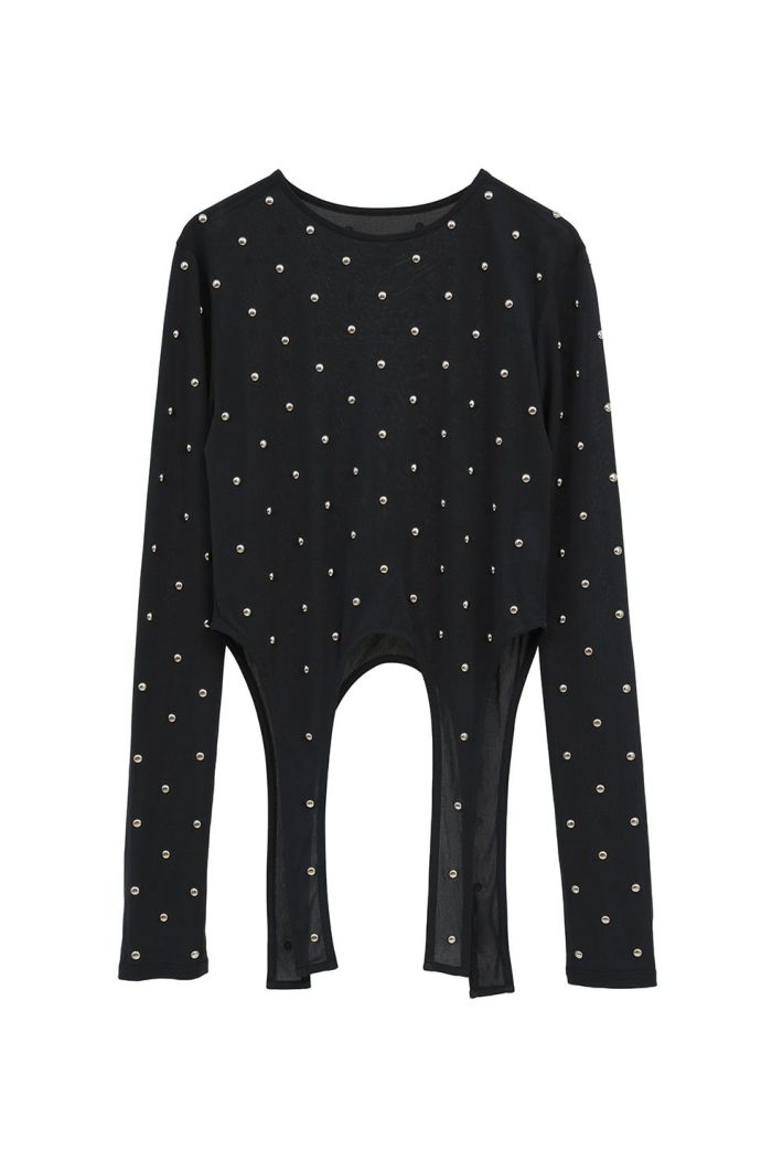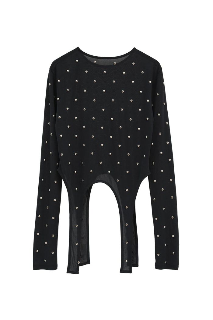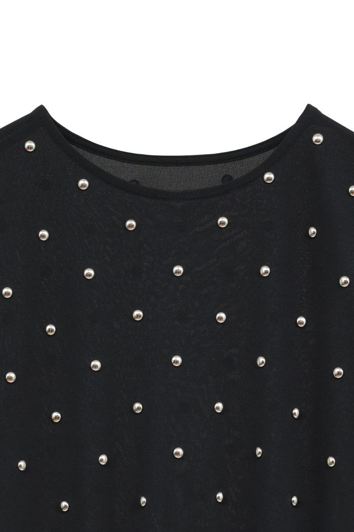 透け感のあるシアー素材にスタッズをあしらい、モードなエッジを効かせた一枚。