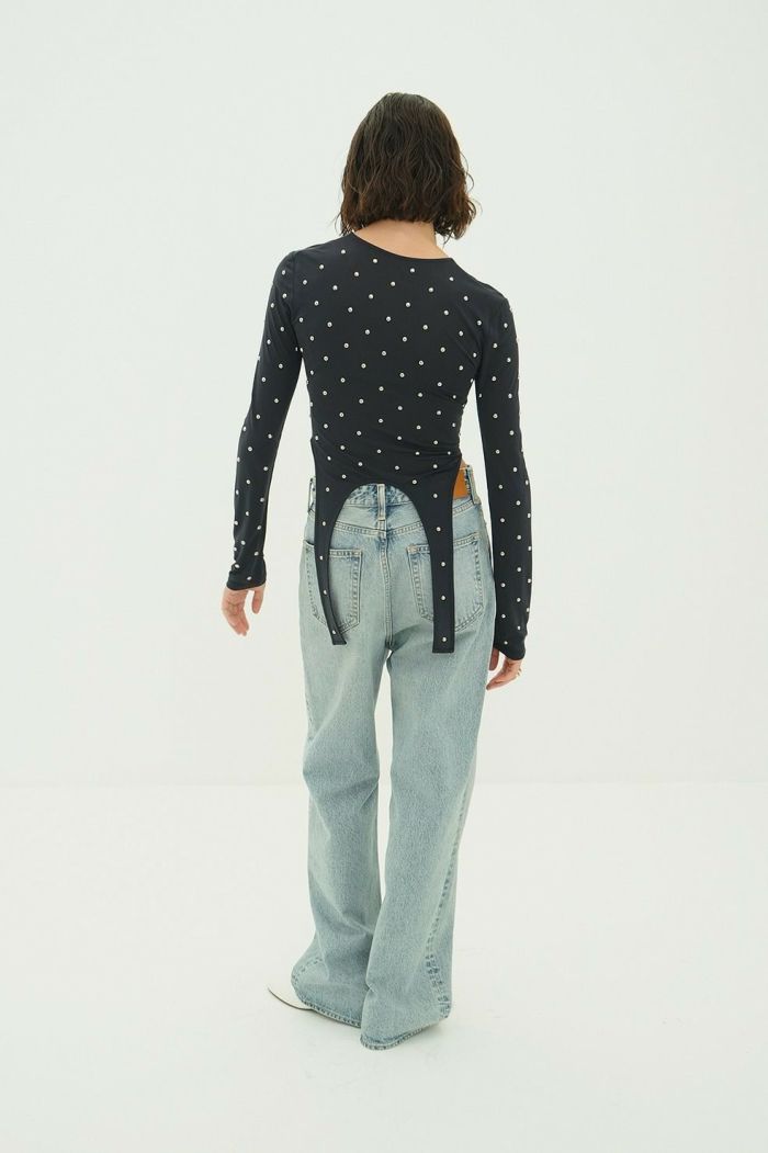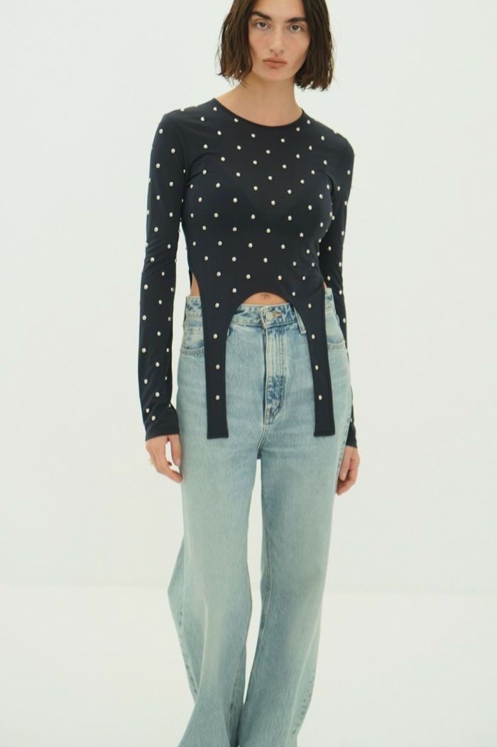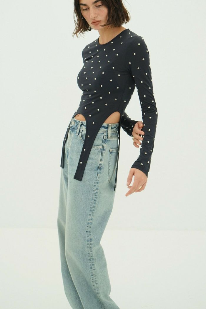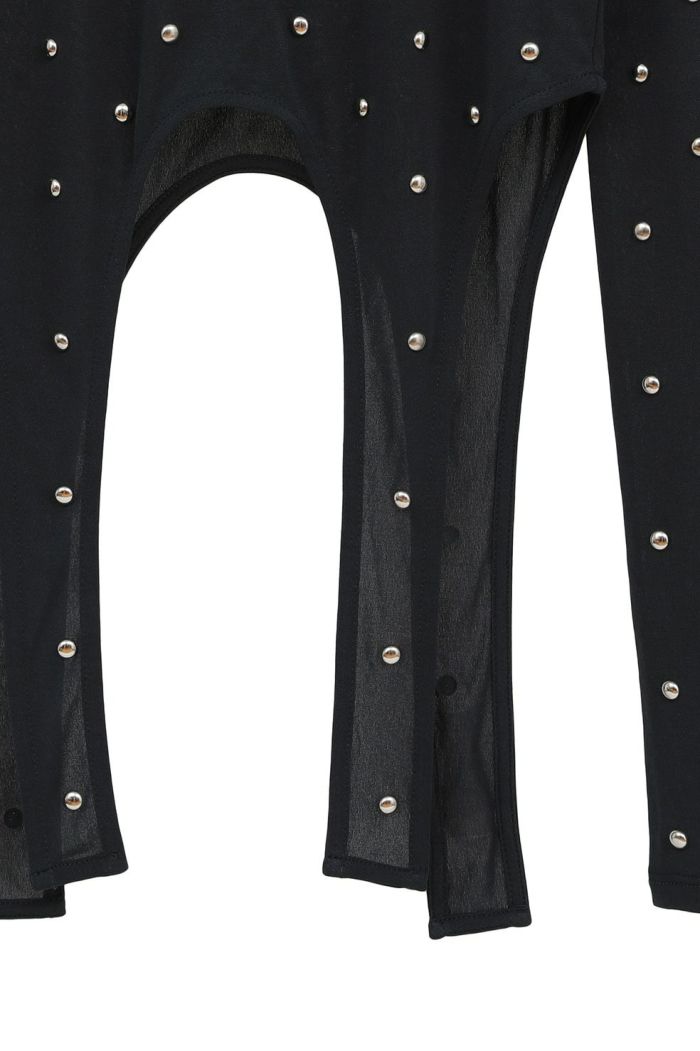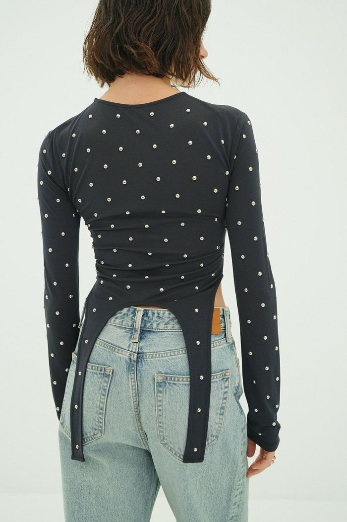 透け感のあるシアー素材にスタッズをあしらい、モードなエッジを効かせた一枚。