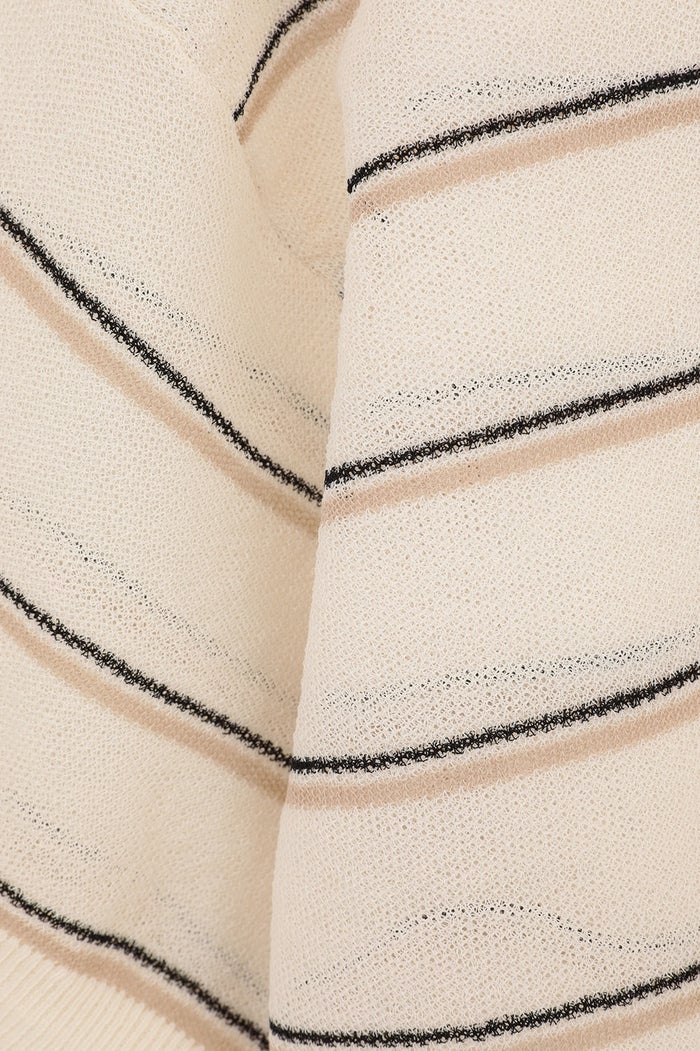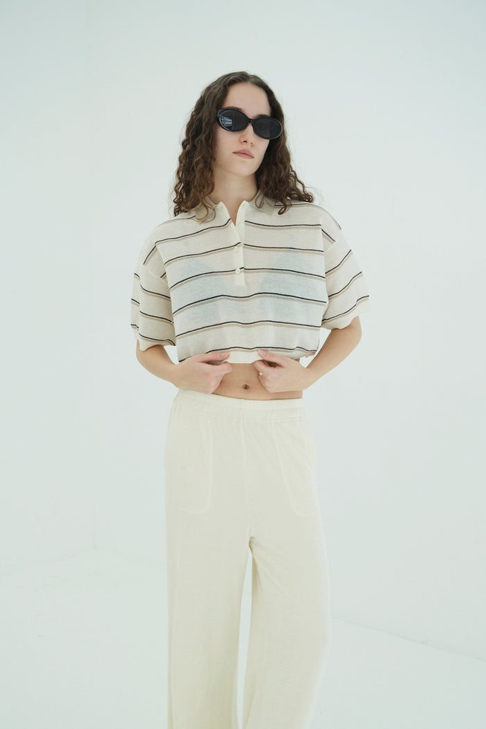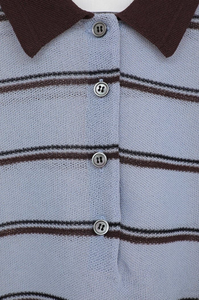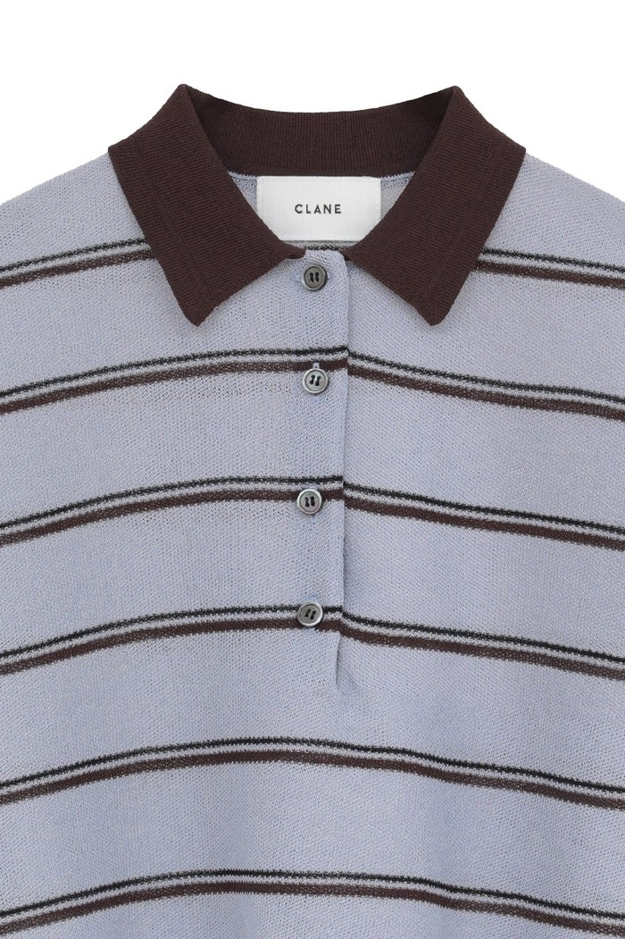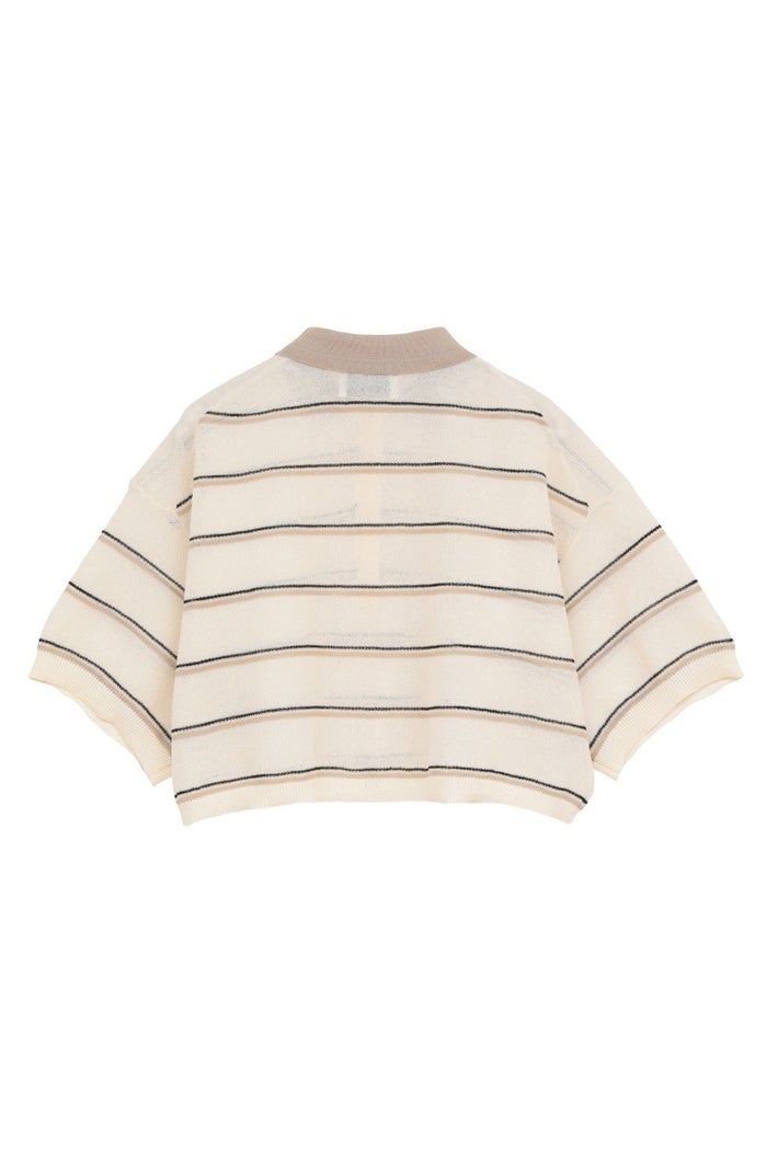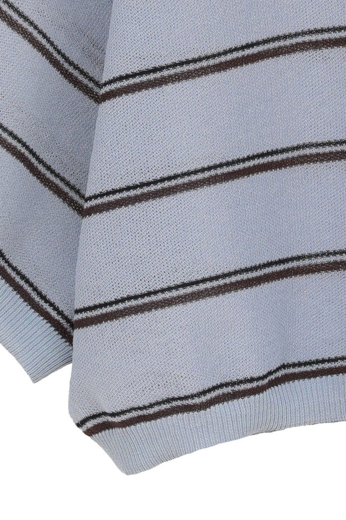 軽やかな透け感のあるシアーニットで編み立てた、ボーダー柄のポロニットトップス。 3配色のボーダーを組み合わせることで奥行きのある表情に仕上げました。シアーでありながら編地にほどよい膨らみをもたせ、立体感のある佇まいに。襟元には編地変化を加え、さりげない動きを演出。 柔らかく軽やかな風合いで肌離れの良い着心地も魅力。 クロップド丈ながら身幅にゆとりを持たせ、今年らしいバランスのワイドシルエットに仕上げた、スタイリングの主役になる一枚です。 --------------------------- 裏地:なし ストレッチ:あり 透け:あり --------------------------- ※光の当たり具合や端末等の閲覧環境によって、実際の色味と異なって見える場合がございます。予めご了承ください。 ※表記サイズは商品の実寸で、布製品の特性上、表記サイズと多少の誤差が生じる場合がございます。 ※表記サイズは商品の実寸で、布製品の特性上、表記サイズと多少の誤差が生じる場合がございます。 ※画像の商品はサンプルの為、実際の商品と色味、仕様、加工、サイズ、素材等が若干異なる場合がございます。