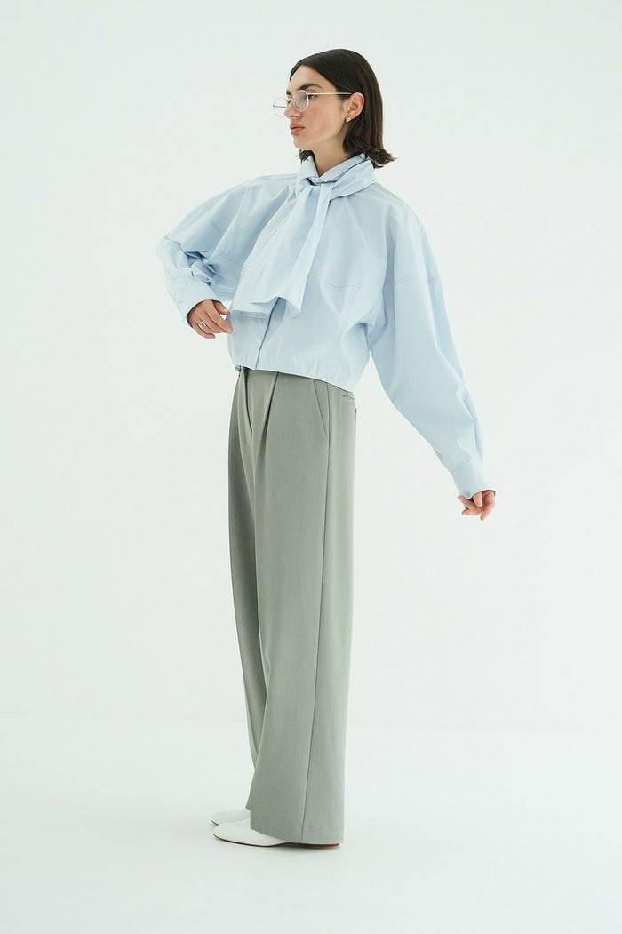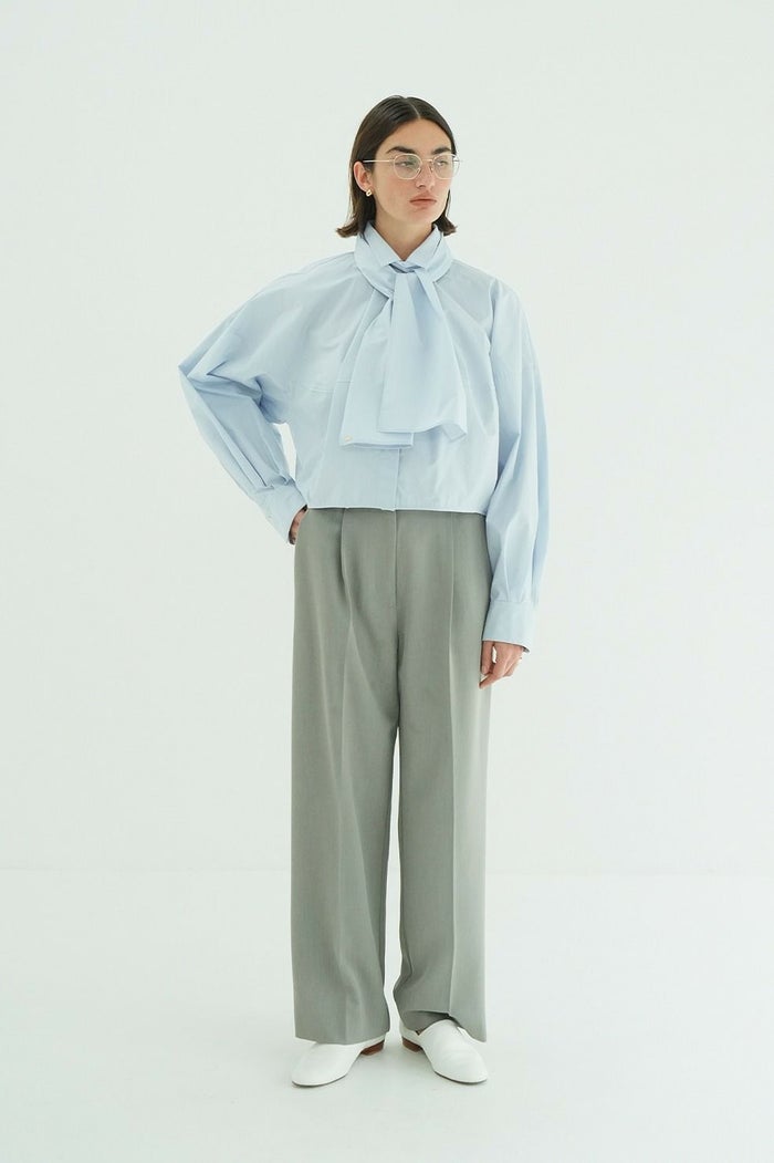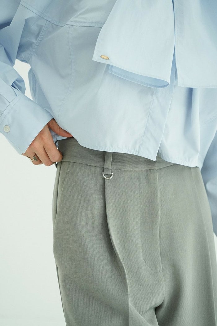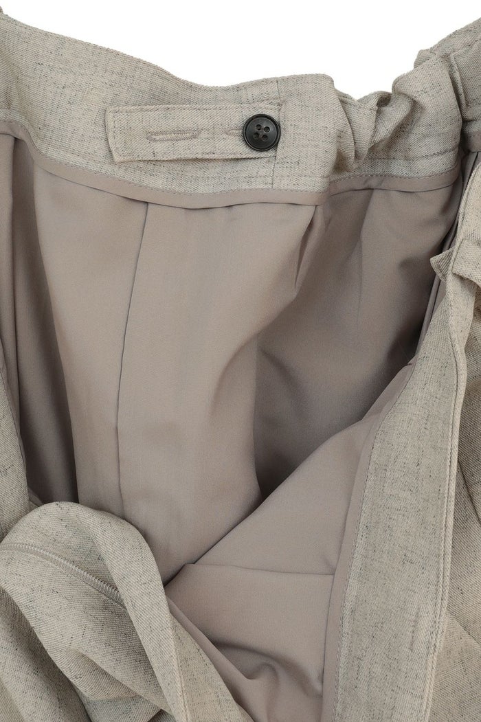 腰まわりを程よくカバーするタックを施し、すっきりとした印象で着用いただけるシルエットに仕上げました。ウエストはアジャスターゴム付きで、ジャストウエストとローウエストの2WAYで着用可能。