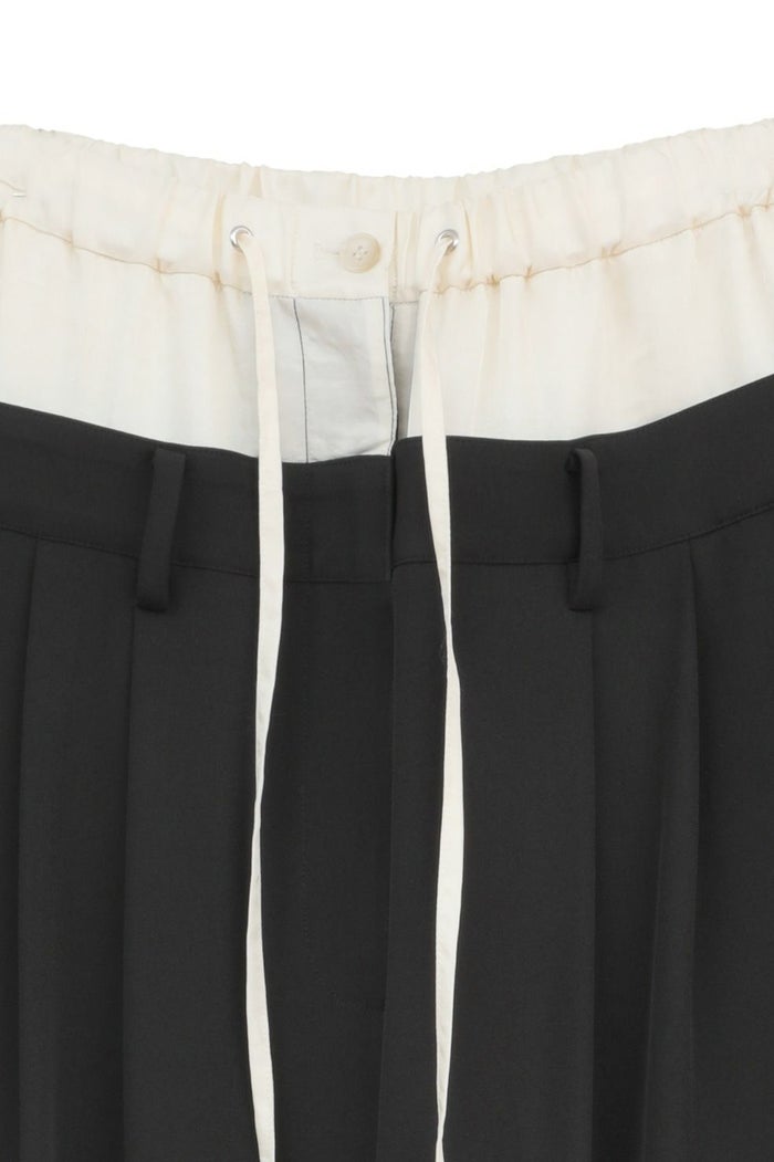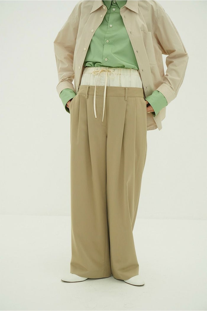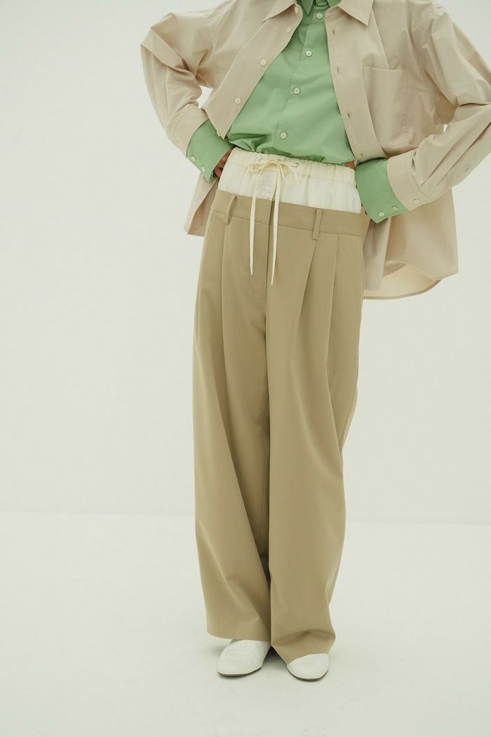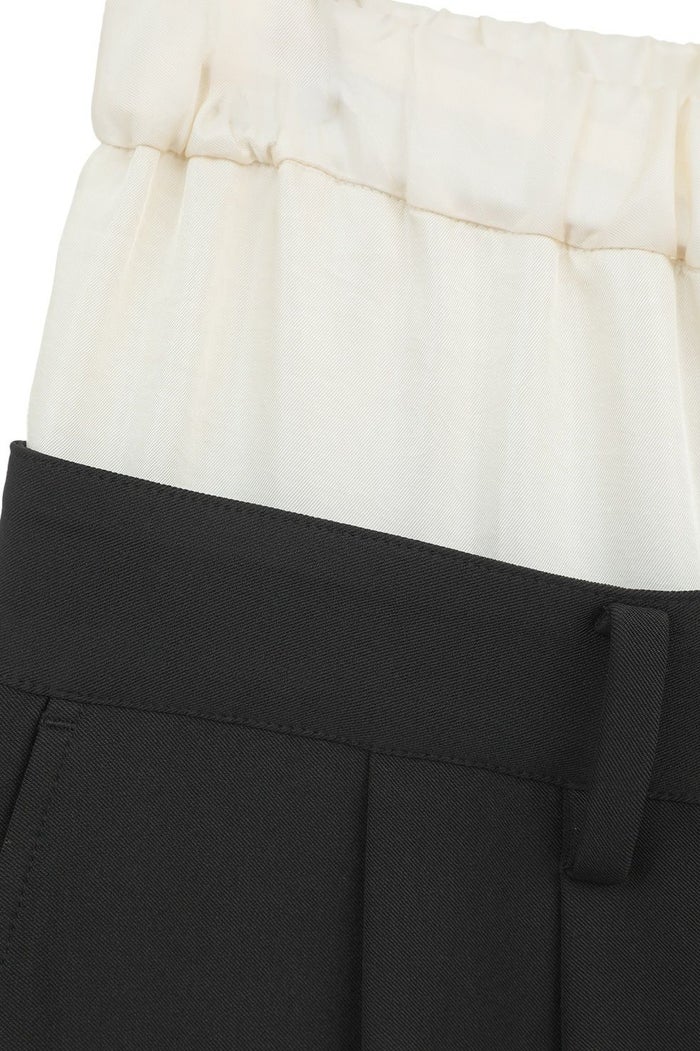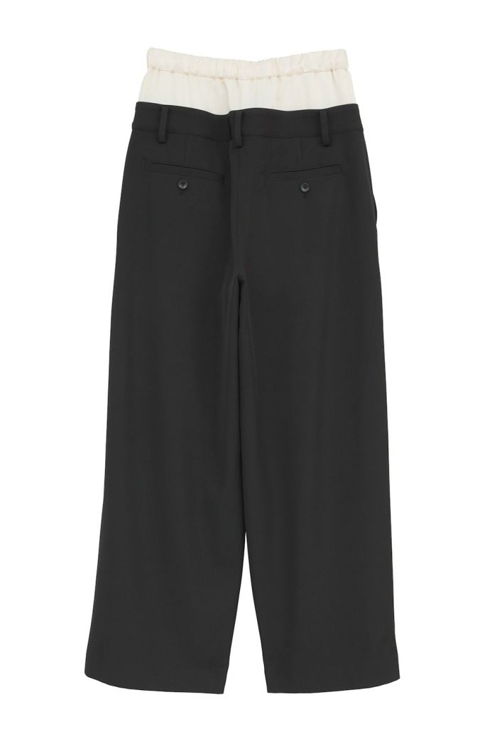 異なる2本のパンツをレイヤードし、ドッキングさせることで、一枚で映えるデザインに仕上げました。はっきりとしたバイカラーと異素材の組み合わせで、レイヤー感をより楽しめます。