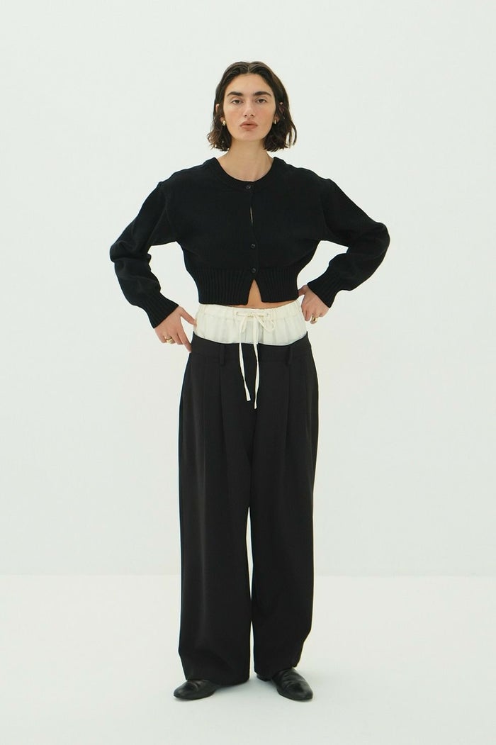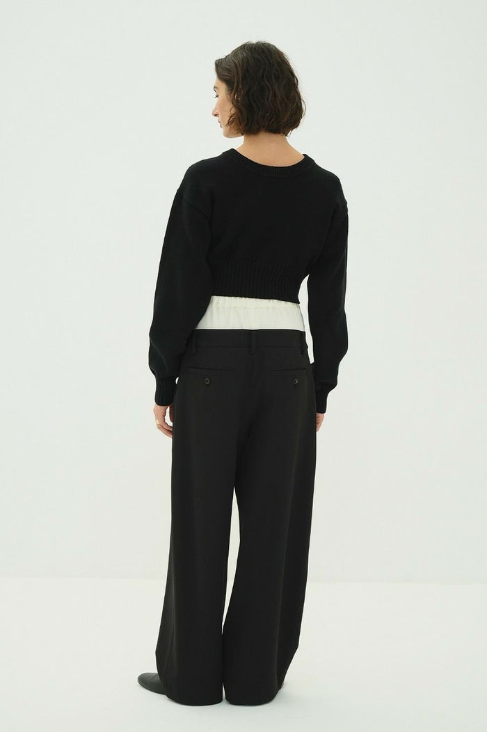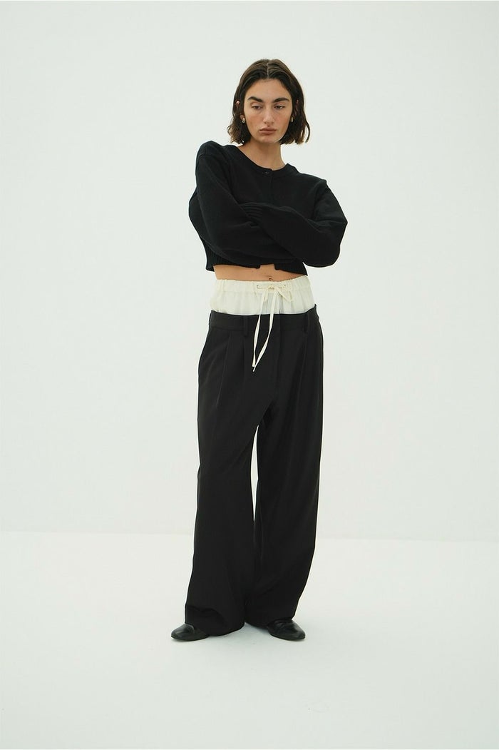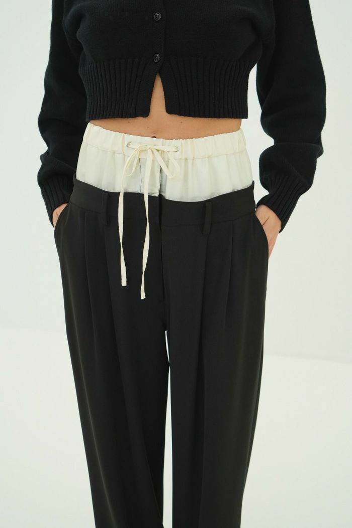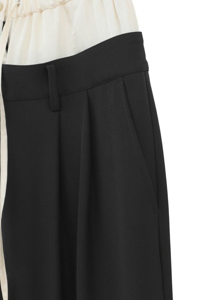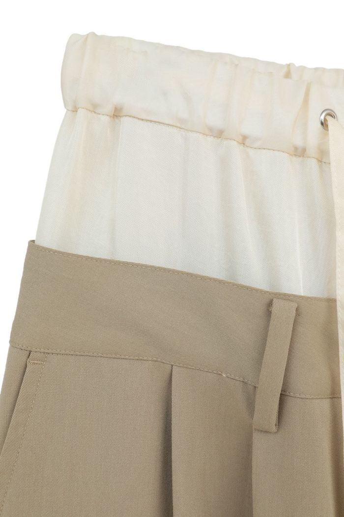 異なる2本のパンツをレイヤードし、ドッキングさせることで、一枚で映えるデザインに仕上げました。はっきりとしたバイカラーと異素材の組み合わせで、レイヤー感をより楽しめます。