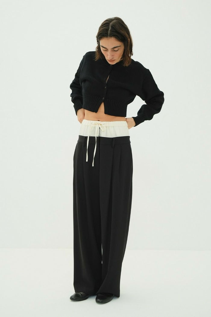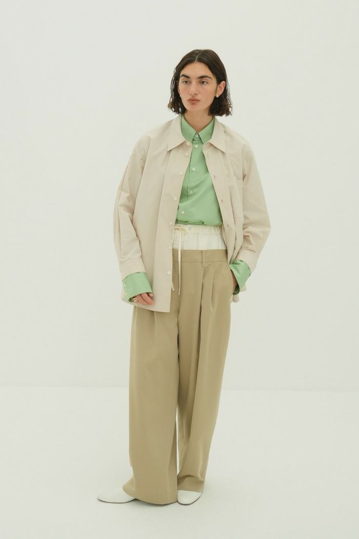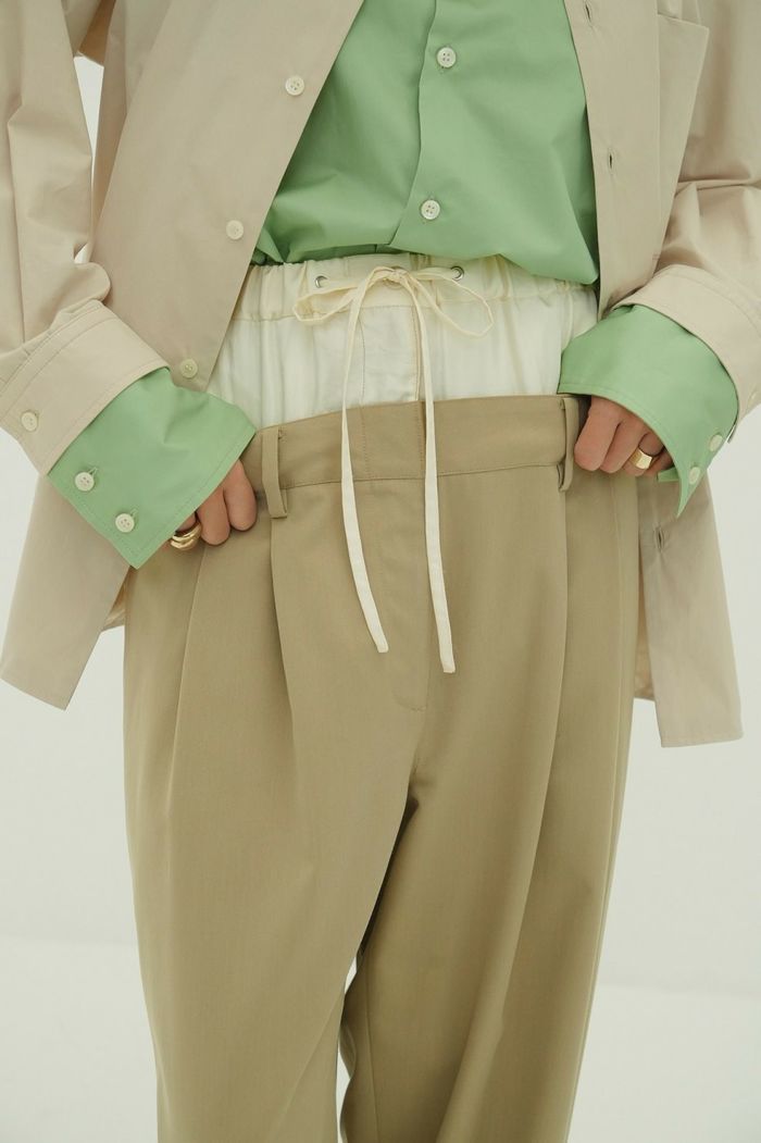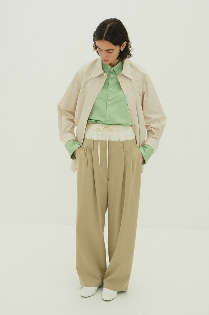 インナーパンツには艶感のある素材を使用し、上品な印象をプラス。アウターパンツはローウエストに設定し、ゆるさと抜け感を表現しました。