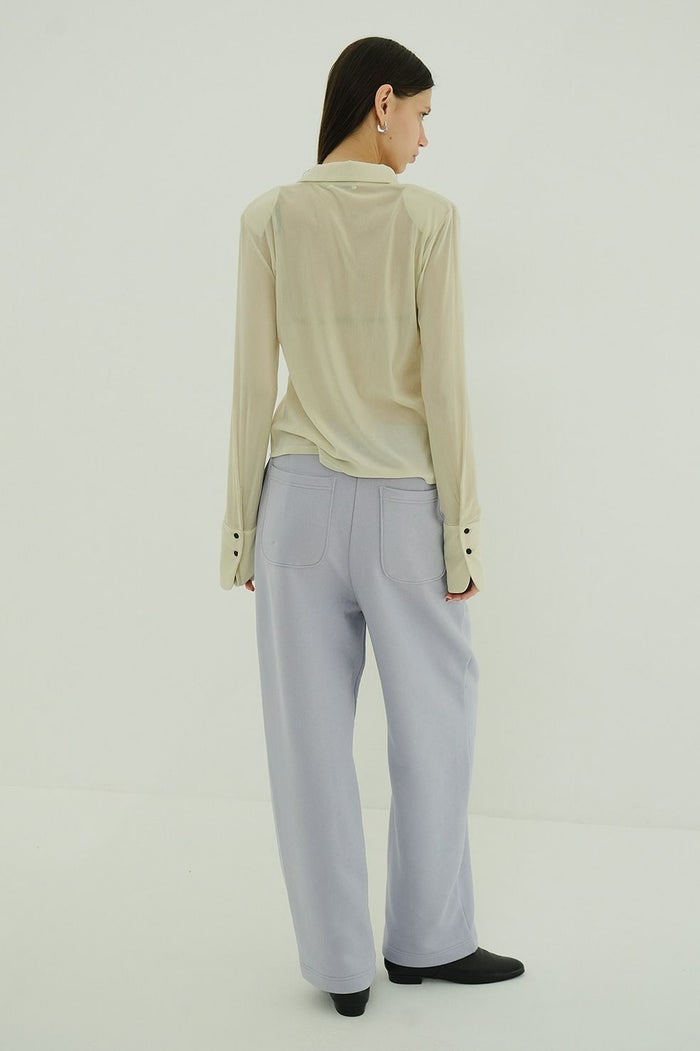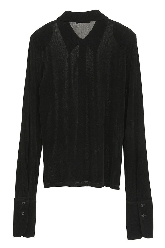 透け感のあるチュールフロッキー素材を使用し、程よくフィットするシルエットが女性らしい印象のポロトップス。