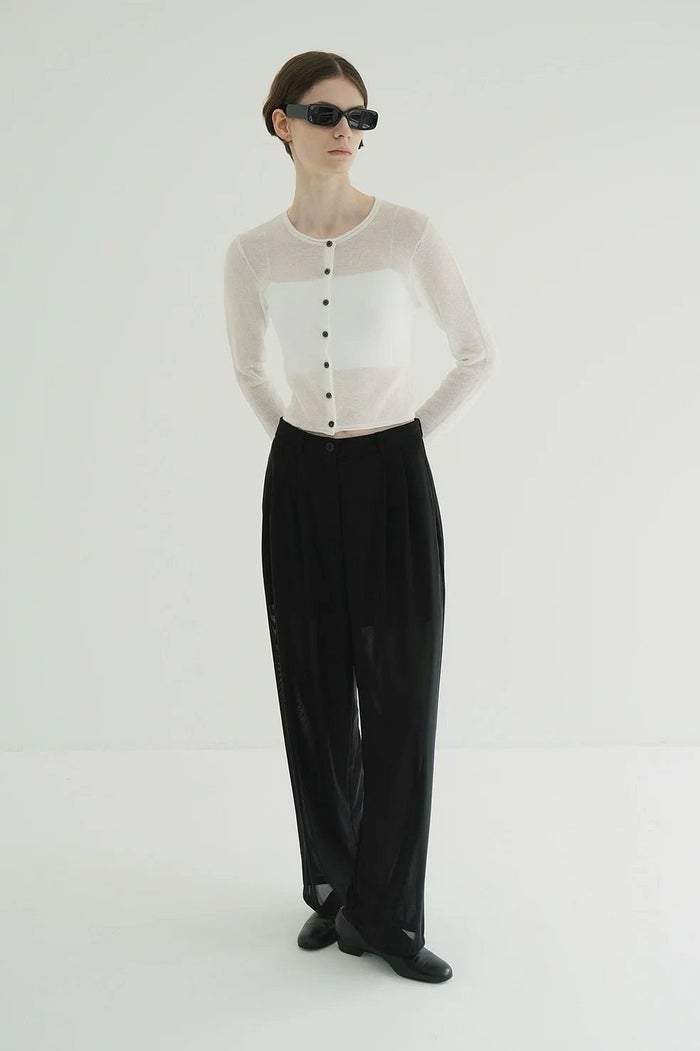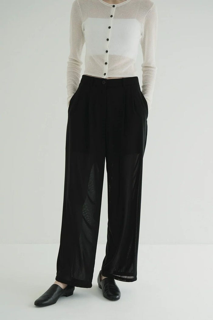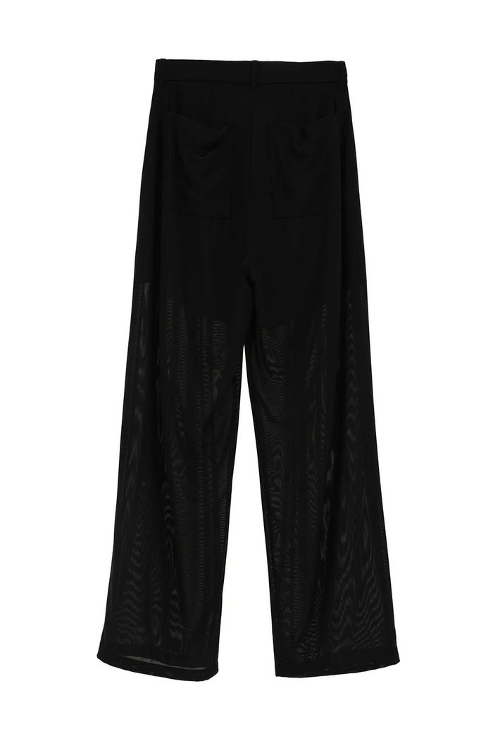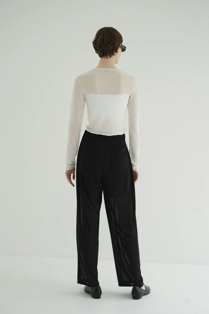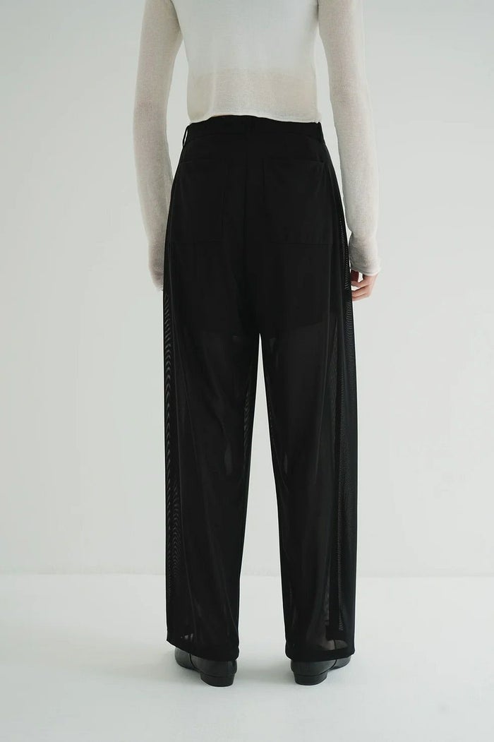 さりげなく素肌が透ける、軽やかなメッシュ素材のシアーカットソーを使用したデザインパンツ。