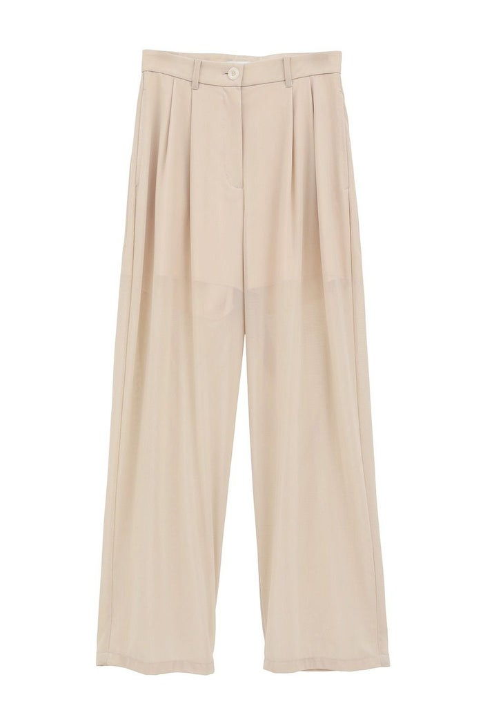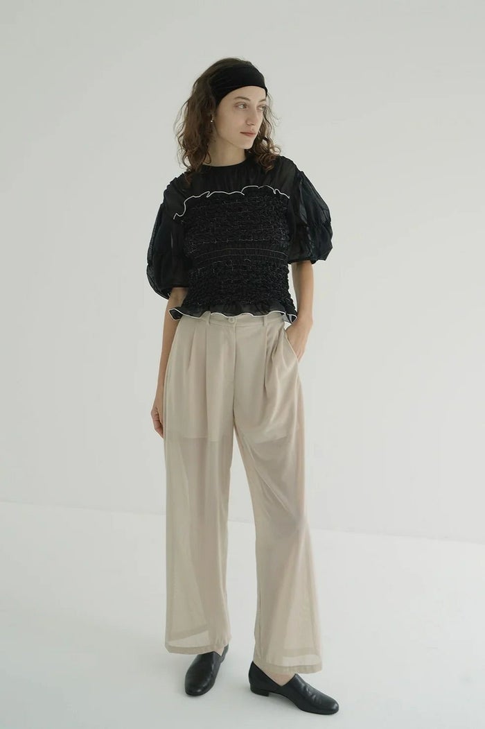 CLANE定番のBASIC TUCK PANTSのシルエットをベースに仕上げており、タックによるゆったりとしたシルエットと、程よい落ち感が魅力。涼しげでありながら、上品な印象を演出します。