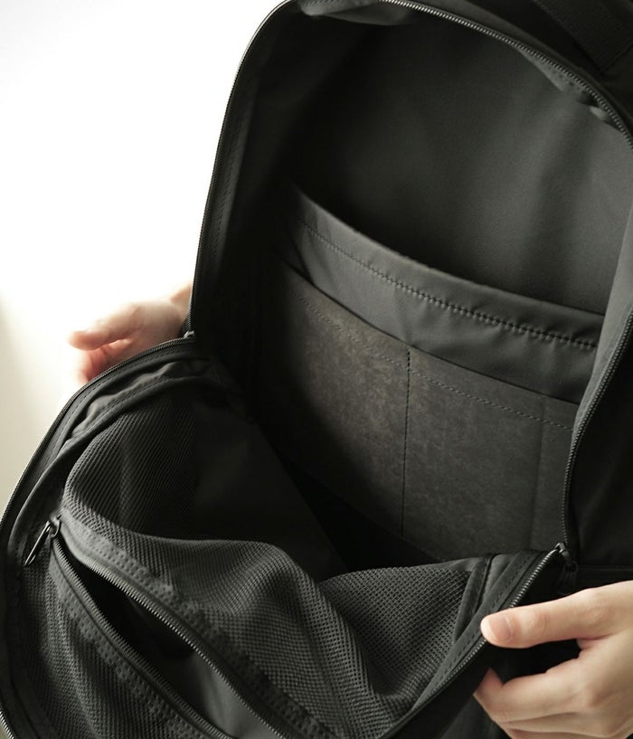 容量はしっかりと確保しつつ、ミニマルなデザインとマチ(D)を抑えつつ縦方向(H)とぎりぎりまで普段使いで嵩張りすぎない横幅(W)のバランスを考えてスッキリとしたデザインにしています。