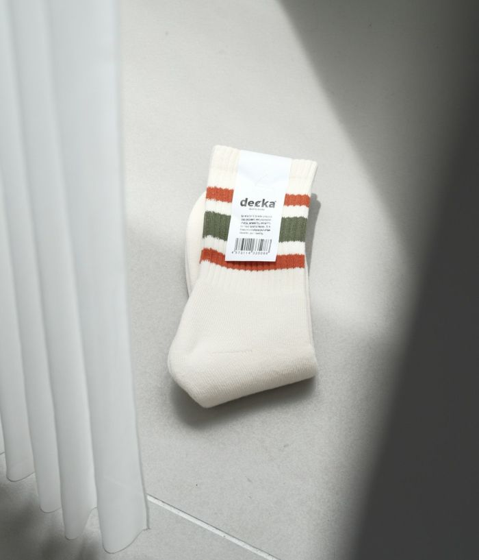 スケーターが一つのカルチャーとして成熟した80年代。70年代に主流だった19インチのハイソックスに変わり普及していったミドル丈のスケーターソックスをショート丈に作り替えた。80年代の西海岸の雰囲気に足された品質が程よい違和感を演出している。