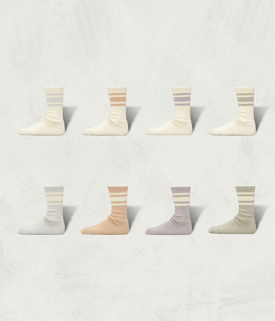 無染色のオーガニックコットンと、廃棄予定だった食材から抽出した成分 で染色したオーガニックコットンを組み合わせて編んだパステルカラーのスケーターソックス。