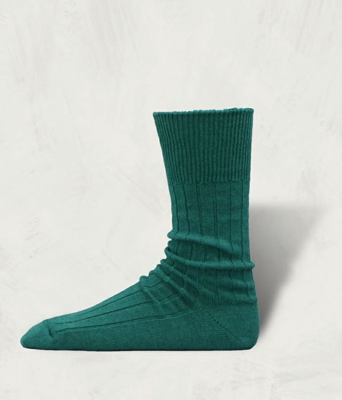 カシミヤとコットンの混紡糸で編みたてた。カシミヤの質感を持ちながら、 耐久性をコットンが補完するバランスの整った素材のリブソックス。