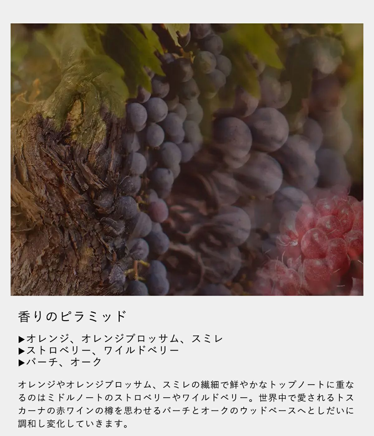 ・オレンジ、オレンジブロッサム、スミレ ・ストロベリー、ワイルドベリー ・バーチ、オーク オレンジやオレンジブロッサム、スミレの繊細で鮮やかなトップノートに重なるのはミドルノートのストロベリーやワイルドベリー。世界中で愛されるトスカーナの赤ワインの樽を思わせるバーチとオークのウッドベースへとしだいに調和し変化していきます。