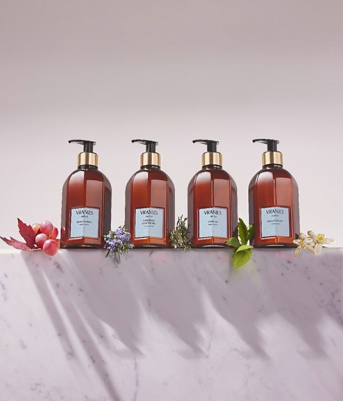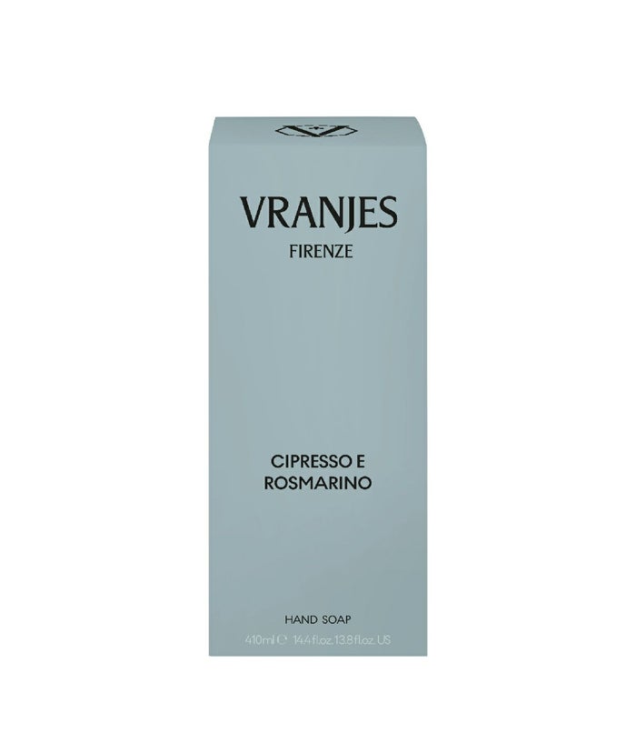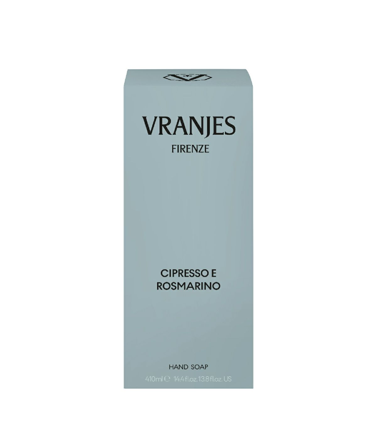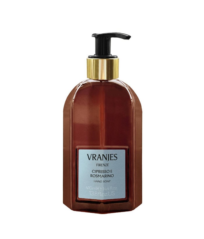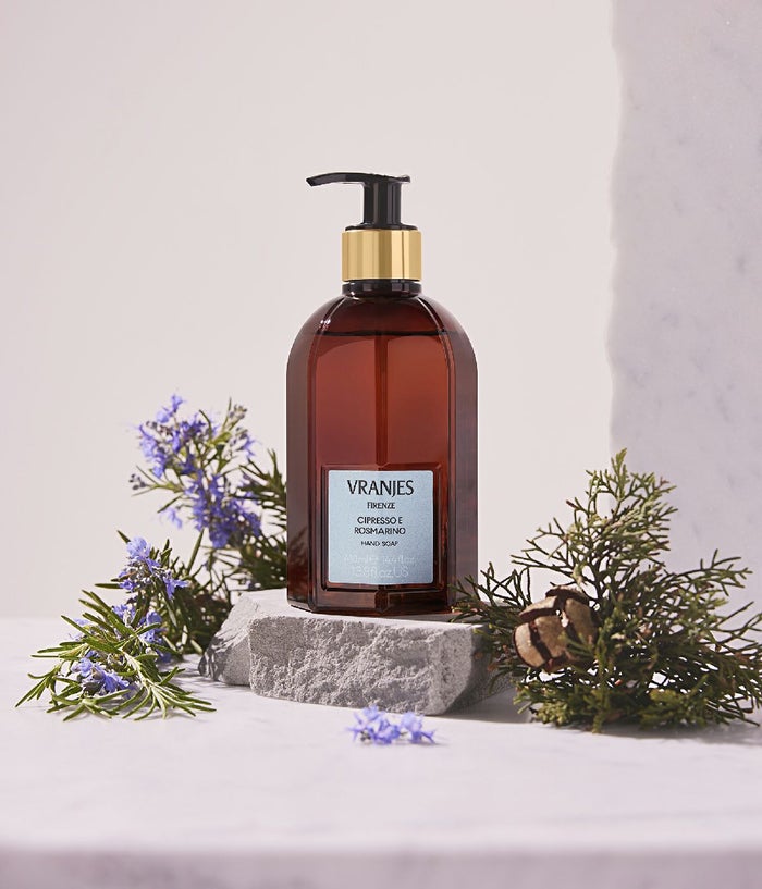八角形のデザインをあしらった琥珀色のボトルのハンドソープ(410ml)。 トスカーナの丘陵地帯の美しさへのオマージュ。 サイプレスのバルサミックなノートとローズマリーのフレッシュなアロマがやさしく溶け合い、心地よい調和を生み出します。