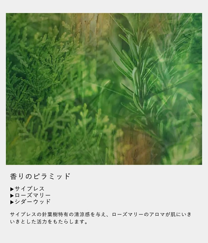 ・サイプレス ・ローズマリー ・シダーウッド サイプレスの針葉樹特有の清涼感を与え、ローズマリーのアロマが肌にいきいきとした活力をもたらします。