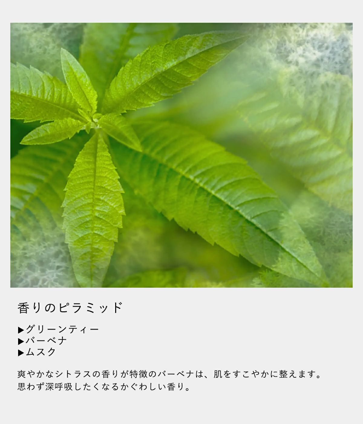 ・グリーンティー ・バーベナ ・ムスク 爽やかなシトラスの香りが特徴のバーベナは、肌をすこやかに整えます。思わず深呼吸したくなるかぐわしい香り。