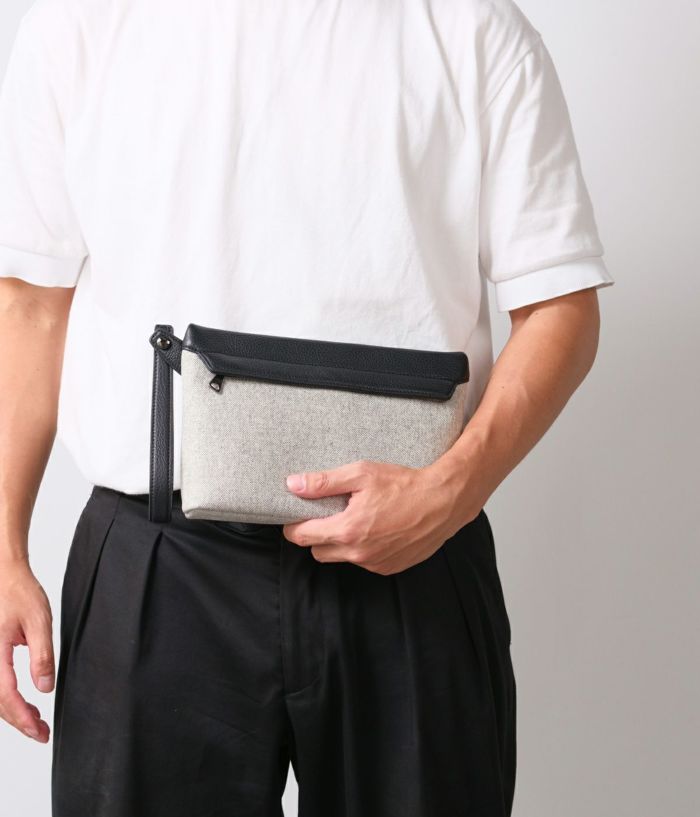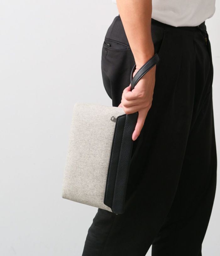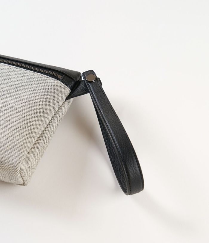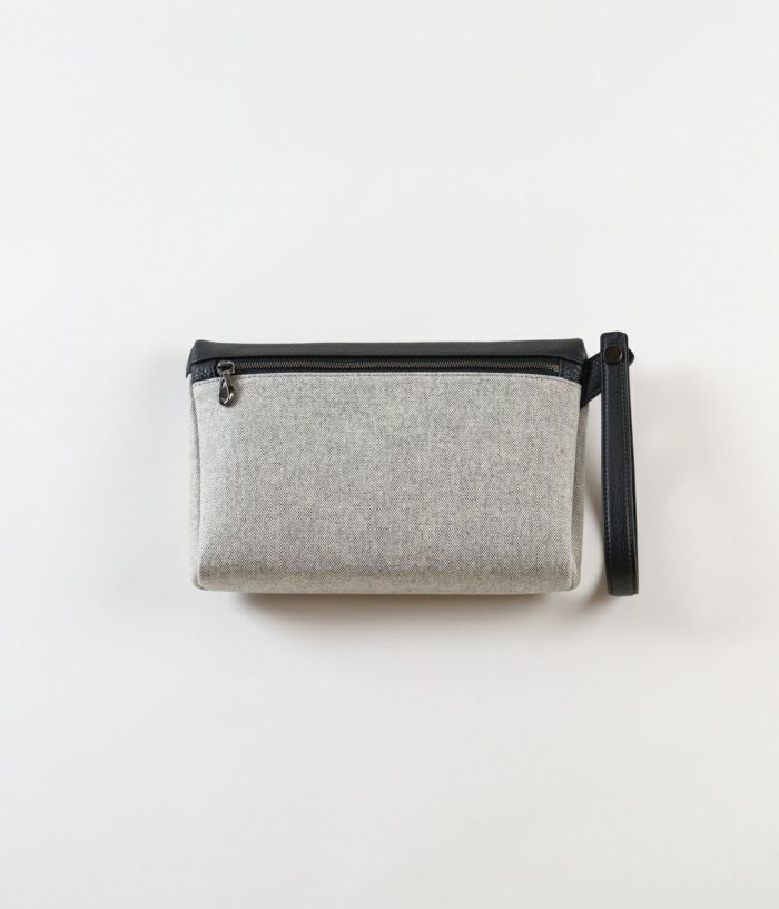長財布がすっきり収まるコンパクトサイズ。手首に掛けても、手持ちしても軽やかに持ち運べるポーチです。