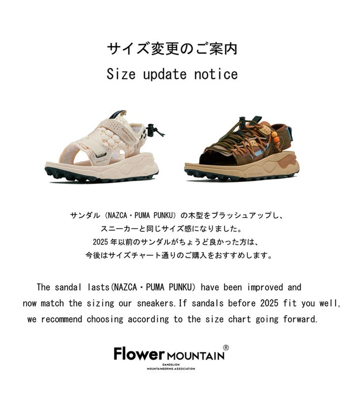 (NAZCA・PUMA PUNKU)の木型をブラッシュアップし、スニーカーと同じサイズ感になりました。2025年以前のサンダルがちょうど良かった方は、今後はサイズチャート通りをご購入ください。
