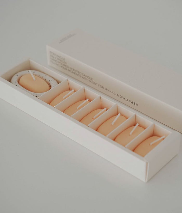 「一日5時間、暖かい香りであなたの瞬間を満たします」 "Filling your moments with scent for 5hours a day, a week" 1日5時間、そして1週間、35時間が使える7つのキャンドルと専用ホルダーで構成されています。キャンドルは植物性ソイワックスと最高級香料を利用して製作します。人為的でない自然の香りを込めて、快適に香りを楽しむことができます。 パッケージに構成されているキャンドルを使い切った後は、詰め替えキャンドルを個別に購入して使用していただければ、永久にホルダーを使用することができます。 1日1回、ろうそくを灯す瞬間だけは、完全な休息の時間になりますように。