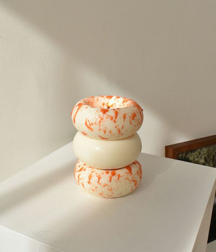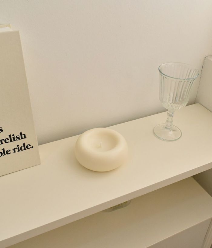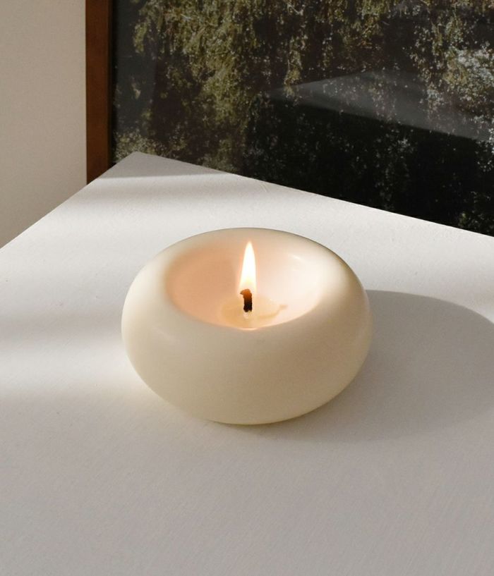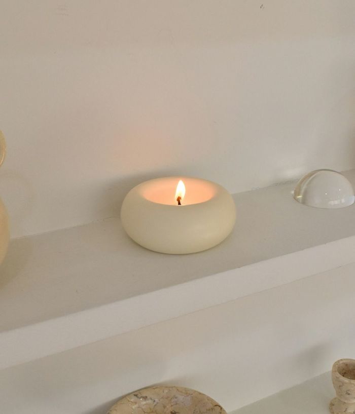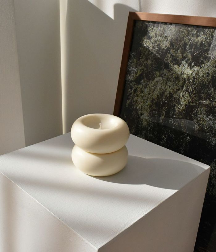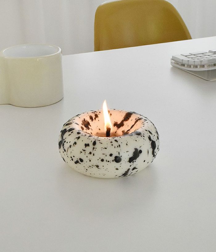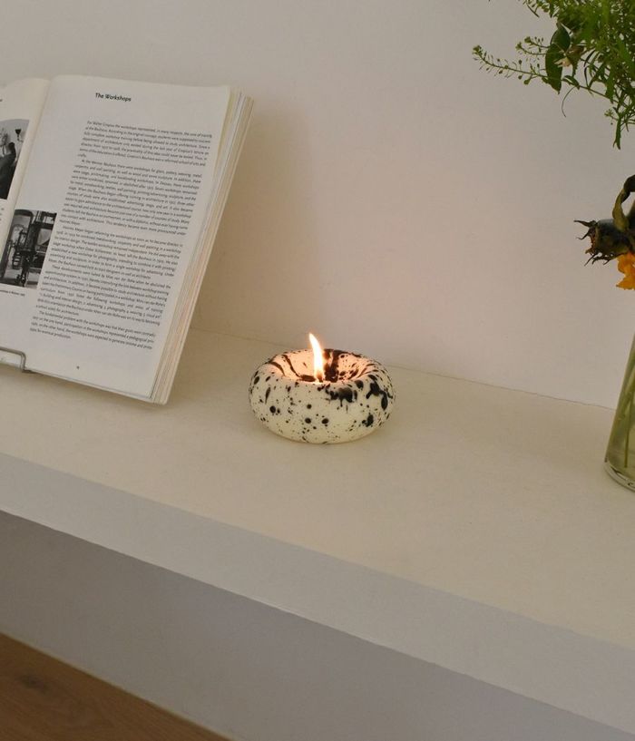 単なる円形ですが、上から押したような印象を与えて面白い要素を加えました。芯のある部分は凹状に処理してキャンドルがもう少しゆっくり溶けるようにデザインしました。表面に撒いたような処理をすることで、どの空間でも存在感を感じることができます。(表面は一つずつ手作業で処理し、手作業の特性上個体ごとに差があります。)